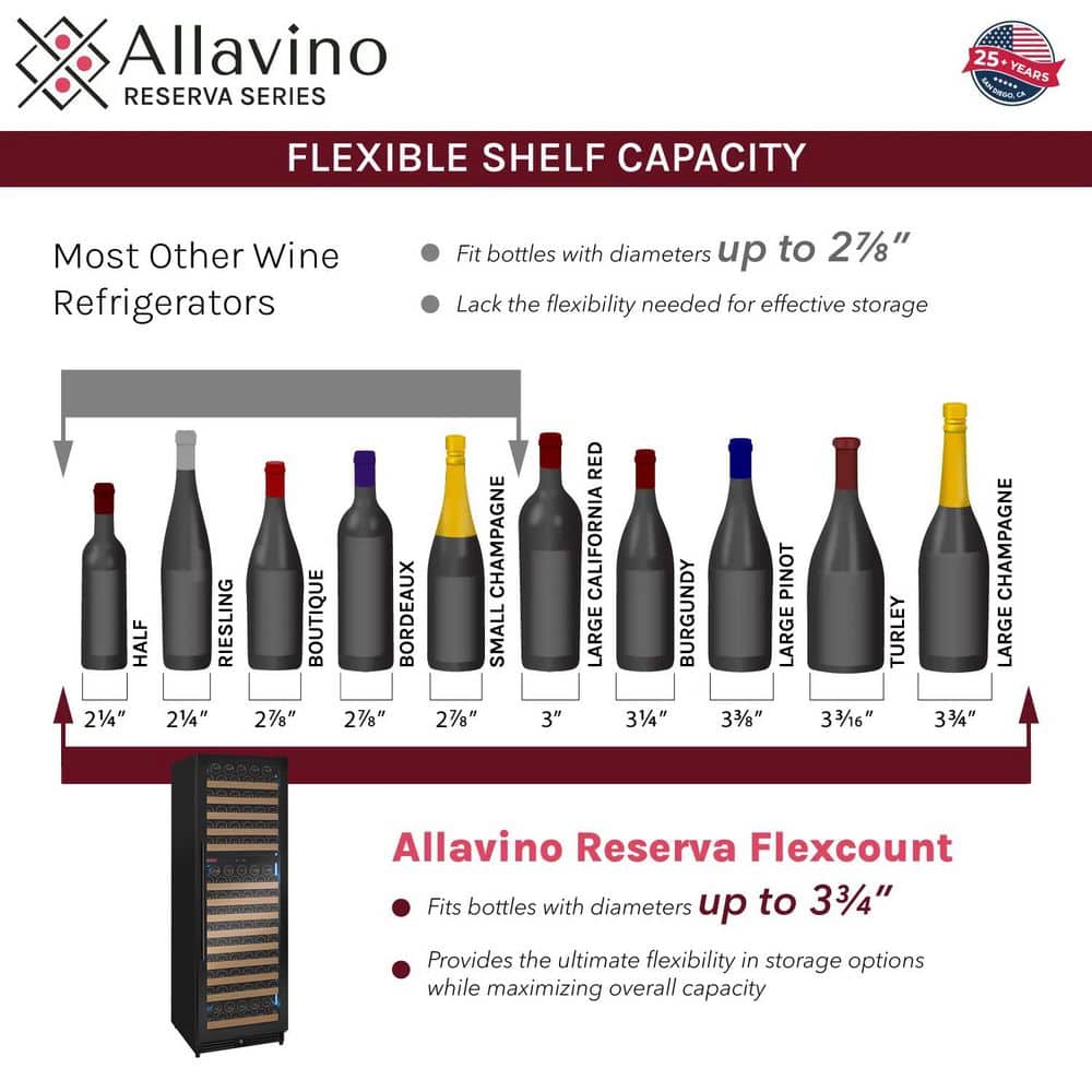 Allavino's VSW71LD-2BR Reserva Series 172 Bottle 71 in. Tall Dual Zone Right Hinge Black Metal Wine Refrigerator with Tru-Vino Temperature Control Technology features 2- independently controlled temperature zones that allow you to store both red and white wines at different temperatures. The wine storage racks feature wood slats that cradle your bottles for added protection. The seamless black metal door showcases an elegant and clean profile while also resisting visible fingerprints, and the tinted LowE glass protects your wine from the harmful effects of UV light. The customizable LED lighting allows you to choose from 9-color options and 5-brightness levels. Unlike incandescent lighting, LED lighting does not give off heat that can damage your wine. A digital control panel allows you to precisely set the temperature in each zone independently, between 41°-64° Fahrenheit. Energy efficient Tru-Vino Cooling Technology delivers precise temperature control with low vibrations and ultra-quiet operation. Allavino's trademarked FlexCount shelving design provides the ultimate flexibility in storage options while maximizing capacity. It gives you flexible storage options for a diverse collection of up to 172-wine bottles.