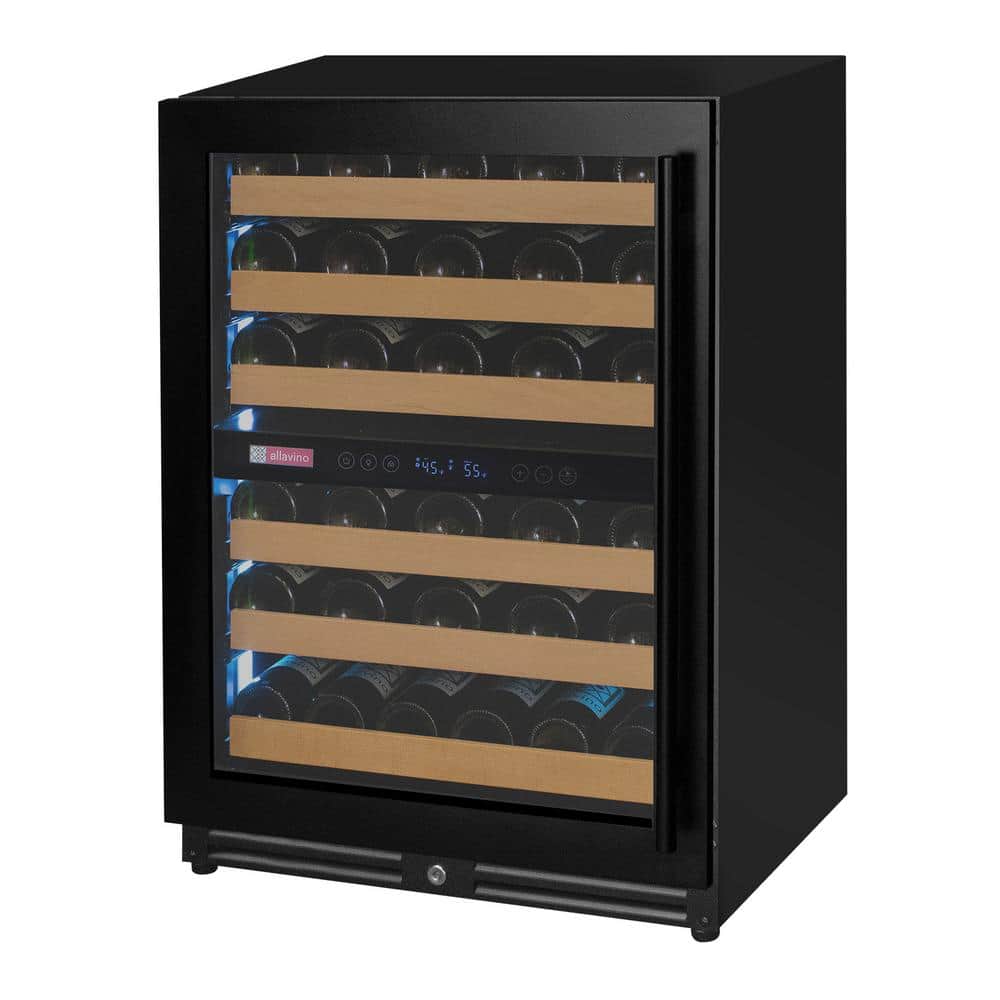 The Allavino Reserva Series VSW5134D-2BL Dual Zone Wine Refrigerator with Tru-Vino Temperature Control Technology makes it easy to store up to 56-wine bottles of various sizes and can be used as a stylish freestanding unit or built into your cabinetry. The seamless black door showcases an elegant and clean profile while also resisting visible fingerprints, and customizable LED lighting allows you to choose from 9-color options and 5-brightness levels. Unlike incandescent lighting, LED lighting does not give off heat that can damage your wine. Protect and preserve your wine collection with the latest innovation in wine storage technology by Allavino. Precisely set your desired temperature with the easy-to-use digital control panel and trust in Tru-Vino Temperature Control Technology to protect your collection through consistent temperature maintenance. Allavino's exclusive FlexCount wine racking technology cradles bottles and is designed with vibration-reduction technology to protect aging wines. This unique shelving design allows for ultimate flexibility and versatility when it comes to storing a variety of bottle sizes and shapes. Easy gliding shelves allow for easy access to your collection without disrupting the delicate wine maturation process.