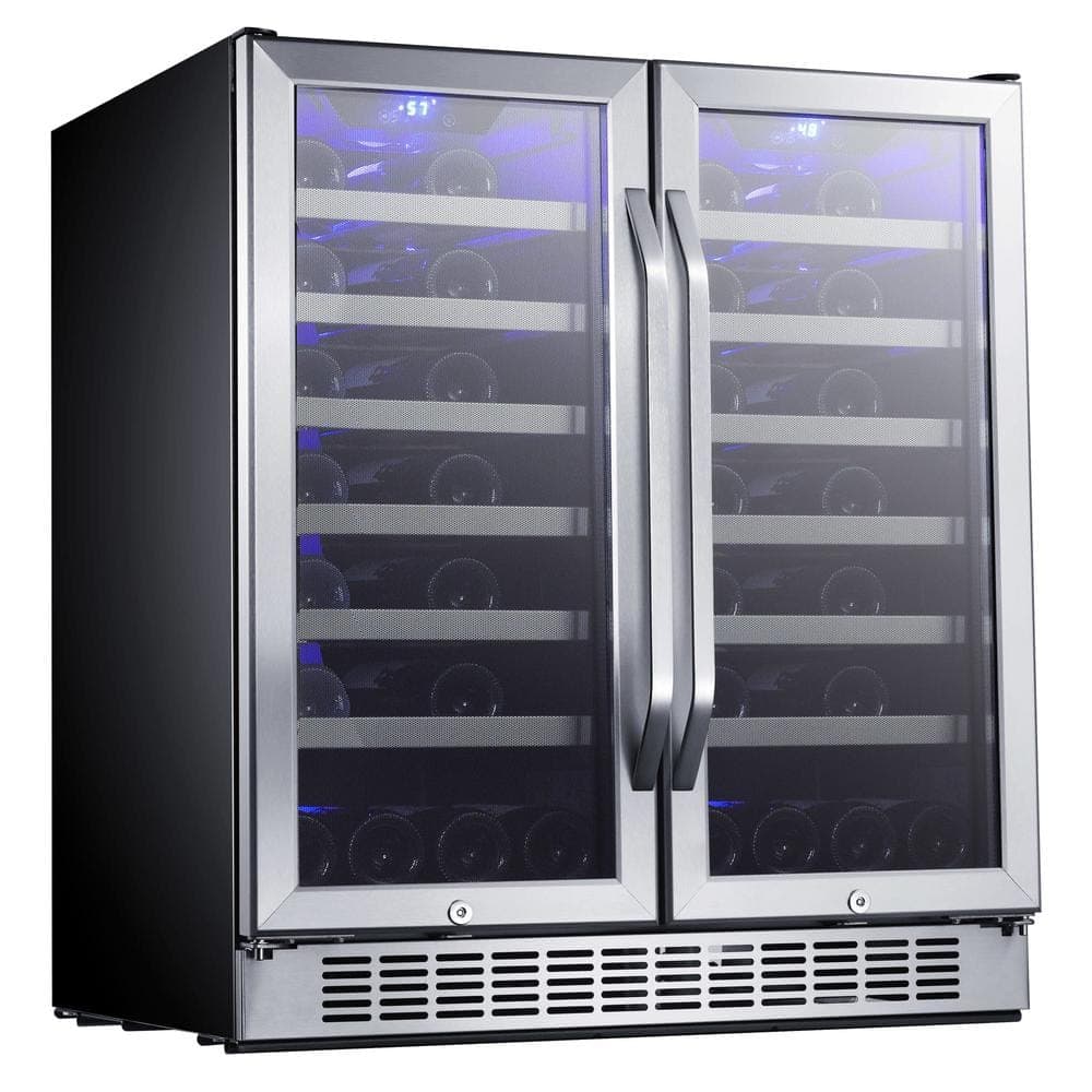 Whether you're a fan of red and white wines or live in a household with divided tastes, the EdgeStar 30 in. Built-In Dual Zone French Door Wine Cooler (CWR5631FD) will ensure your varietals are chilled to precise specifications. A high efficient compressor and air cooling system with internal circulation fans provide even temperature distribution. This high-tech cooler offers a dazzling display with its LED lighting and French-door design, all of which provide easy access for up to 56 standard-size wine bottles (750 ml).