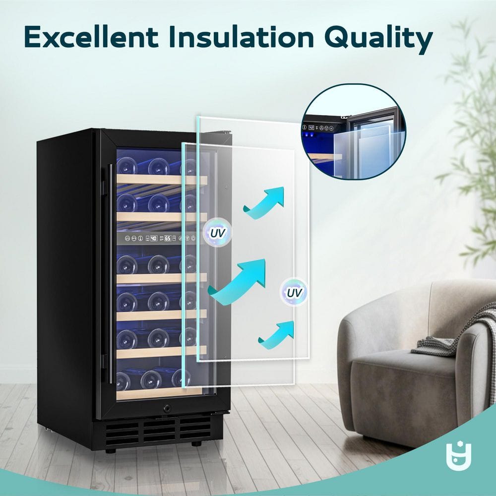 Showcase your wine collection with EUHOMY's 15in dual-zone cooler-30 bottles stored perfectly, whites at 40-55℉, reds at 55-65℉, all via a powerful compressor. Digital temp memory, auto-LED lighting, and a UV-protected glass door simplify use, while quiet (under 38dB) operation keeps spaces serene. Frost-free, flexible (freestanding/built-in), and ETL certified with a 1-year warranty. Elevate your wine storage with EUHOMY today!