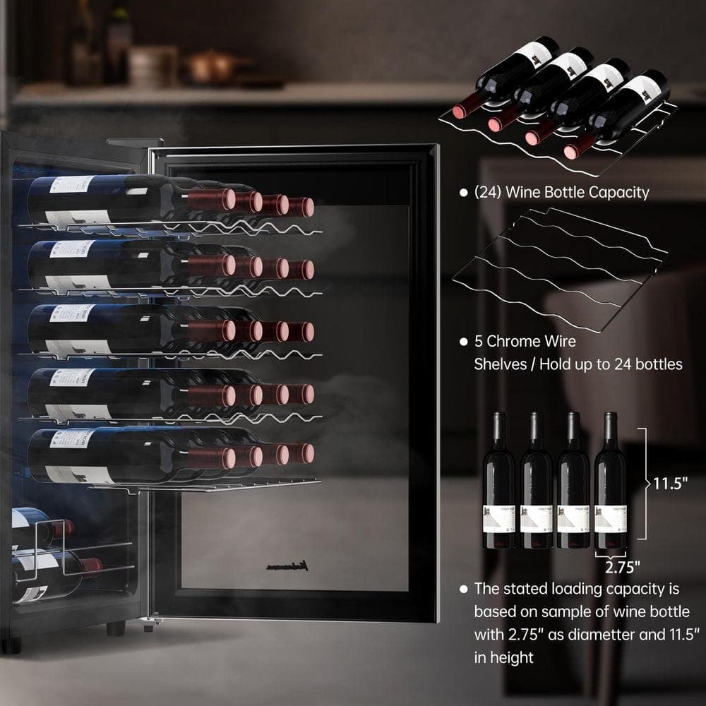 The KALAMERA 24 Single Zone Compressor Freestanding Wine Cooler holds a respectable 24 standard size bottles with a compact body design on your bar counter. It has a double paned glass which trap air between them that acts as an insulator to keep the interior at steady temperature. Seven removable wood shelves help to keep your wines organized while also adding to the elegance of the whole unit.