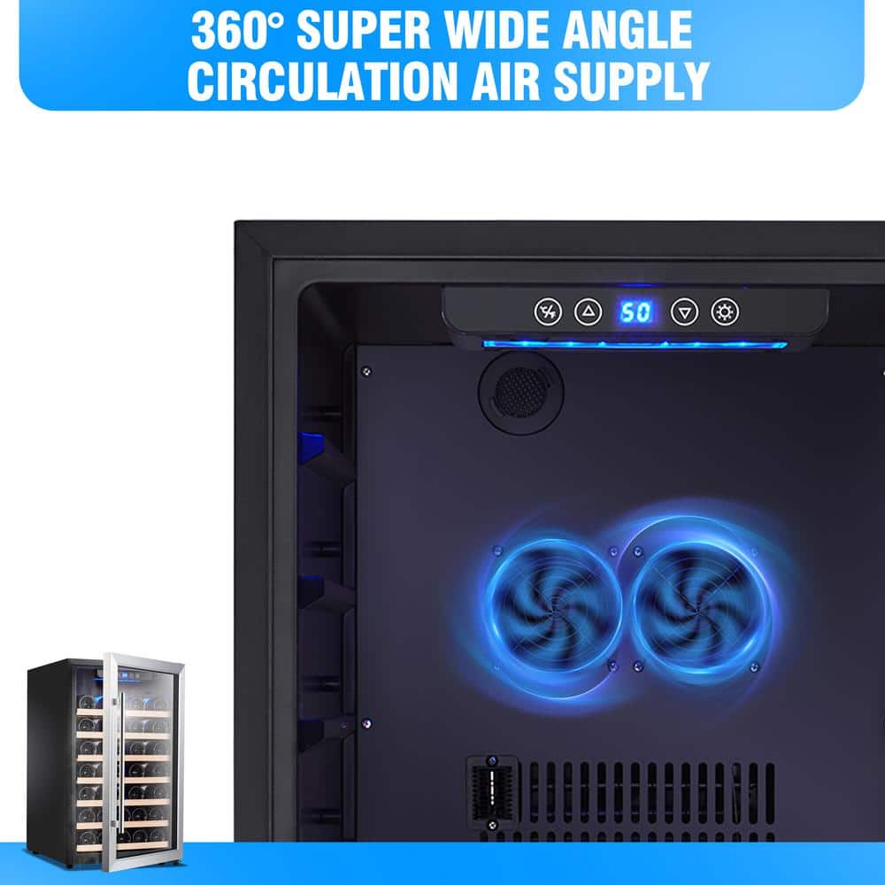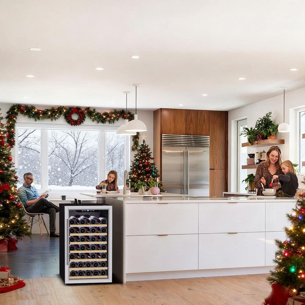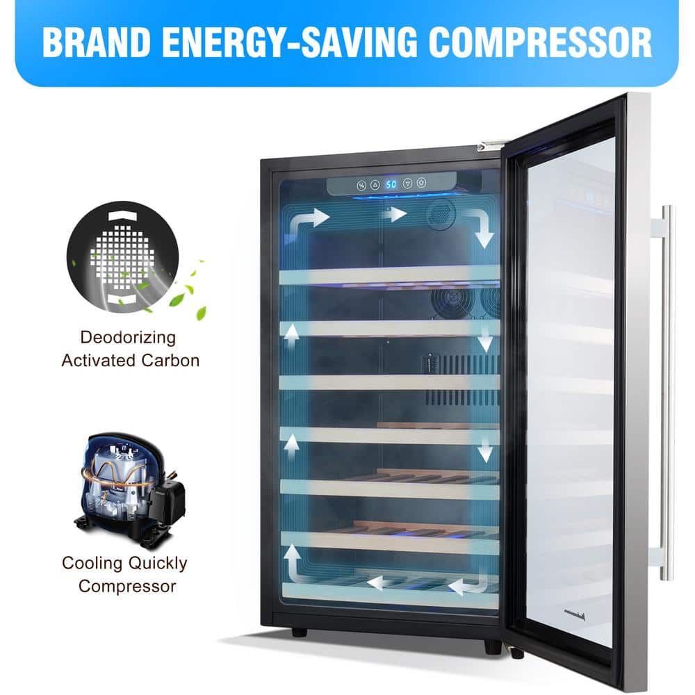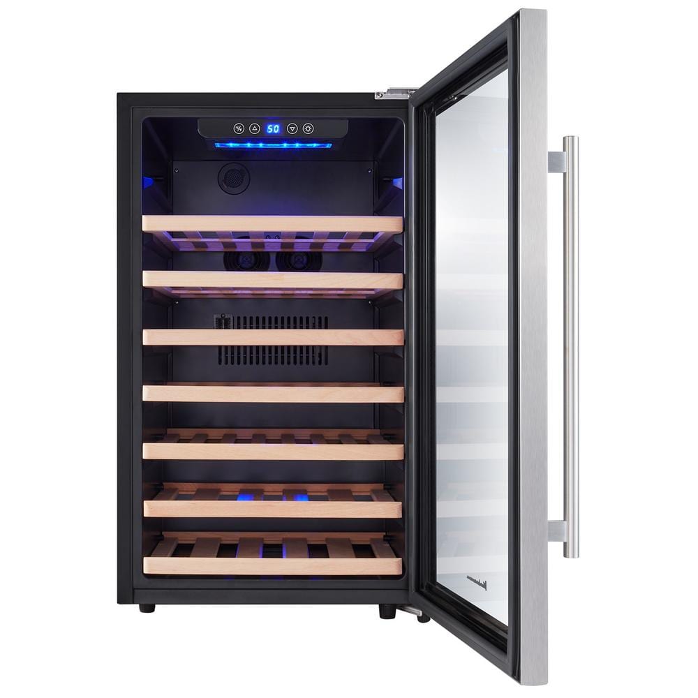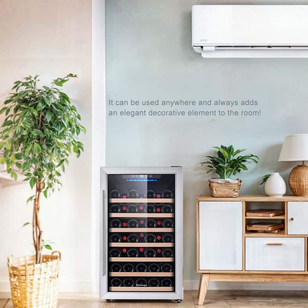 Would you like to display your collection of your favorite wine vintages in your entertainment area, dining room, or home bar? Do you want your wine chilled to the perfect temperature...whenever you want to open a bottle? The Kalamera 50 Bottle Wine Cooler is the perfect size for creating your own mini home wine cellar. The freestanding design allows you to create a home wine bar in your dining room, kitchen, or entertainment area, wherever is most convenient for serving with cocktails and dinner! It plugs into a regular wall outlet, so it can be used anywhere and always adds an elegant decorative element to the room! State-of-the-art single-zone cooling keeps wine at 40-66° F and interior fan keeps even cooling through the beech wood slat shelves and around each bottle. The quiet compressor won't disturb wine sediments, so each and every glass will taste crisp, clean, and perfectly chilled!
