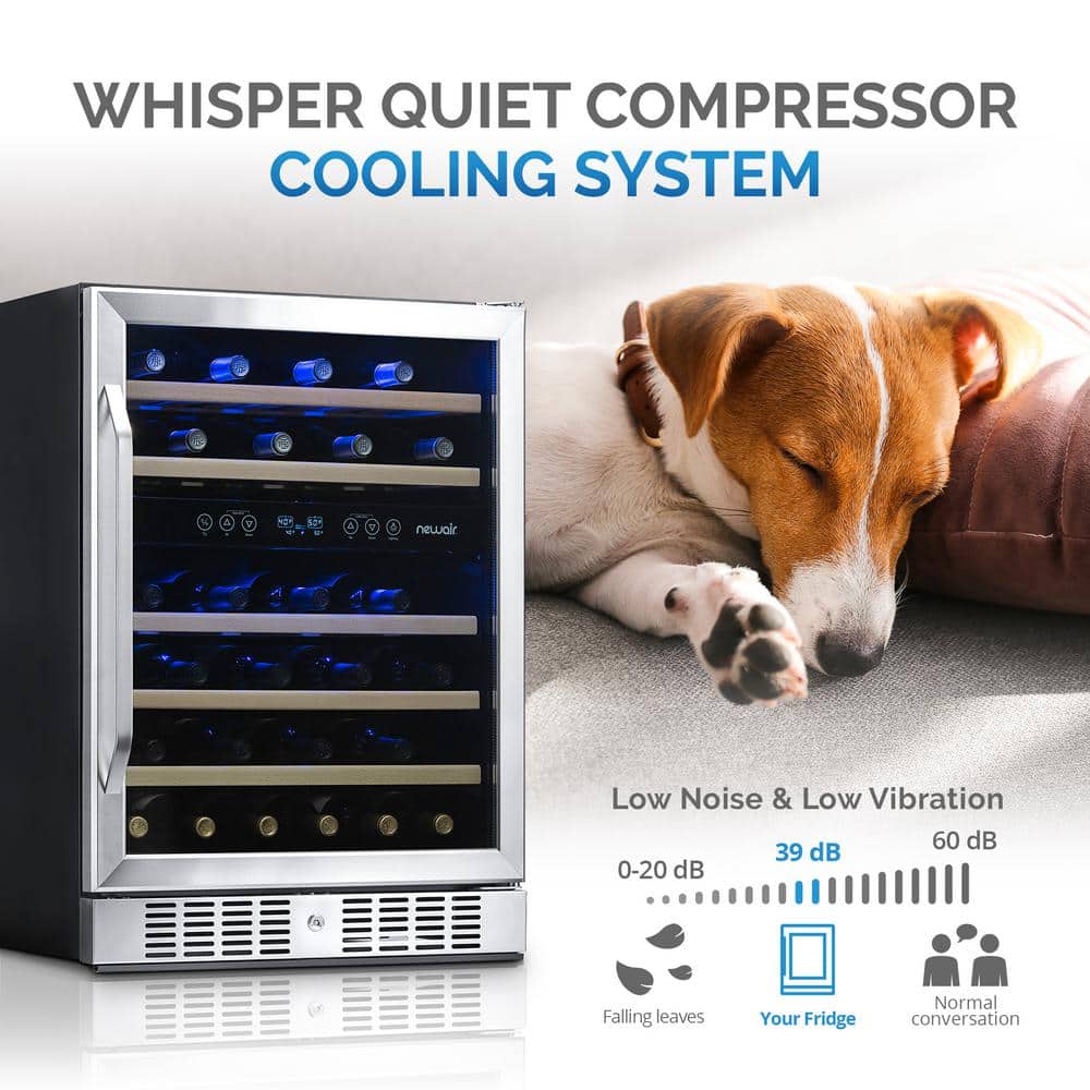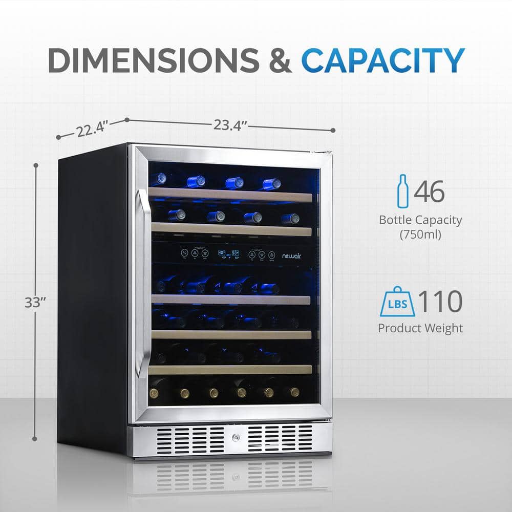 The Newair 24” Built-In Dual Zone 46 Bottle Wine Fridge stores up to 46 bottles and is the perfect upgrade for any home bar or custom kitchen. Designed for seamless built-in installation or freestanding use, this premium wine cooler features a sleek stainless steel design and front-venting system ideal for under-counter placement. The triple-tempered, UV-protected glass door add both functionality and style. Beech wood shelves glide smoothly for easy access, while a carbon filter keeps air fresh. Digital controls offer exact temperature adjustment, and the locking door ensures added security for your collection. Whether you're a casual wine enthusiast or a seasoned collector, this built-in wine refrigerator offers precise cooling and storage for both red and white wines, making it an essential addition to your wine storage setup.