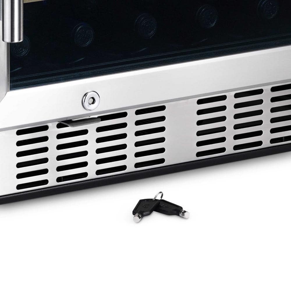 Achieve perfectly chilled wine every time with the Newair 24-in. Built-In Dual Zone 46-Bottle Wine Fridge, a versatile cooler that brings style and function to your space. Its flexible design allows it to be installed seamlessly as a built-in unit or featured as a standalone focal point in any room. Dual-zone digital controls let you set the ideal temperatures for both red and white wines, accommodating collectors and casual enthusiasts alike. Your 46-bottle collection is kept secure and perfectly insulated behind a triple-paned UV-protected glass door with a lock. A quiet compressor and carbon air filter work together to keep your wine fresh and undisturbed while smooth-gliding beech wood shelves and elegant blue LED lighting beautifully showcase your bottles. The sleek stainless steel finish, front-venting system and recessed kickplate complete this sophisticated addition to any kitchen, bar or entertainment area.