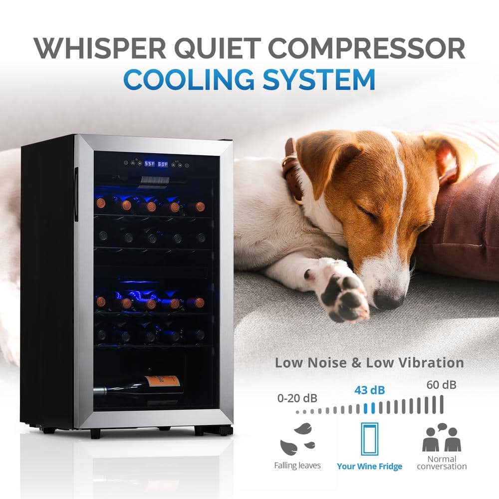 The NewAir Freestanding 28 Bottle Dual Zone Compressor Wine Fridge is The best value for the money When it comes to keeping wine chilled. The quiet, powerful compressor keeps Wine at the perfect temperature between 41° and 64°, while the double-paned glass and Exterior thermostat controls help Keep in the cold for efficient operation. This fridge is equipped with removable racks that help to Provide customized storage For up to 28 standard bottles. The sleek stainless-steel design looks great in any room of the house. Everyone deserves to get the most out of their wine. With the right storage, wine's complexities come to life, which is why the NewAir baseline wine fridge was created. This double zone fridge comes with a compressor system to ensure your collection is kept at the perfect serving temperature. Enjoy your whites and reds to the fullest with a fridge that keeps the internal temperature consistent and has specific features that help preserve wine's flavor and aroma.