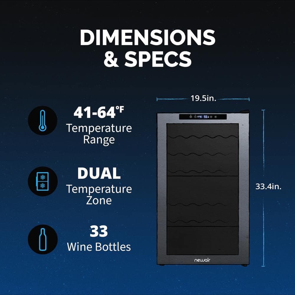 NewAir Shadow Series Wine Cooler Refrigerator 33 Bottle Dual Zones, Freestanding Mirrored Wine Fridge with Double-Layer Glass