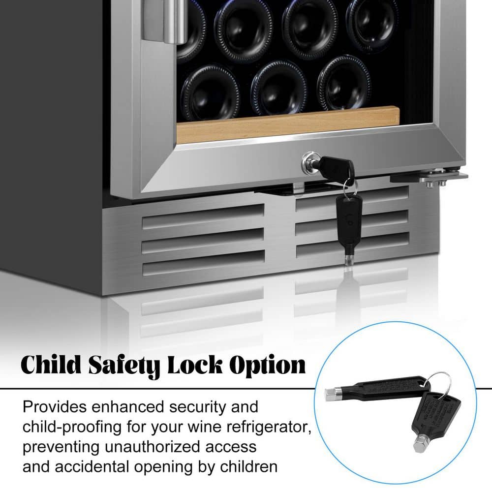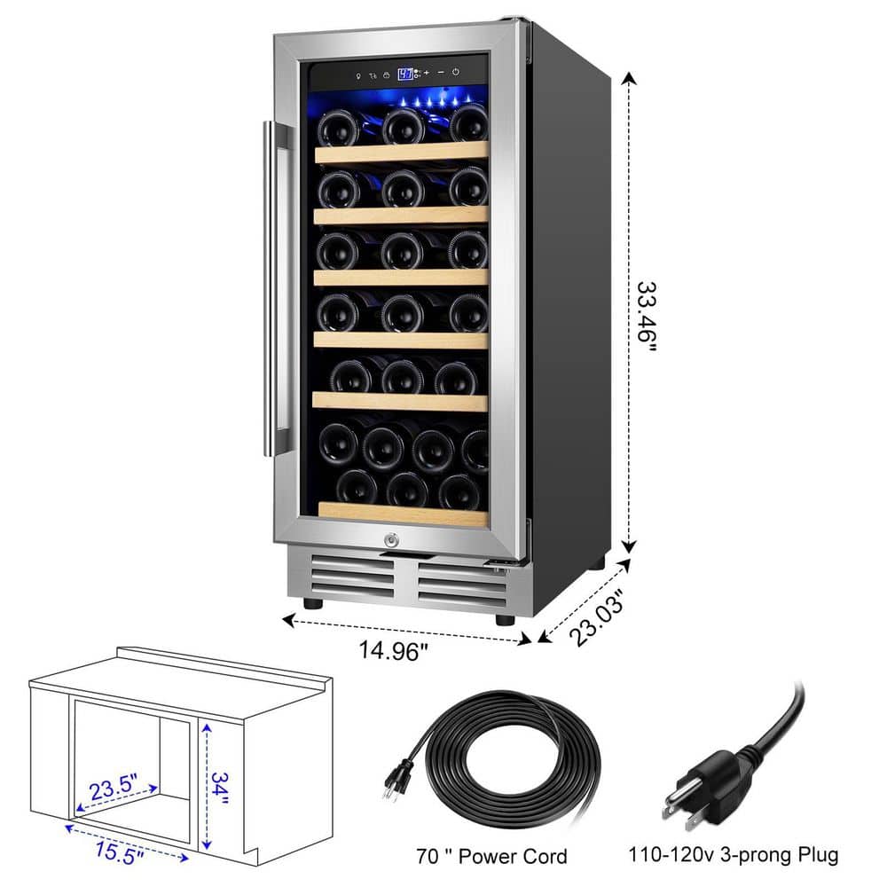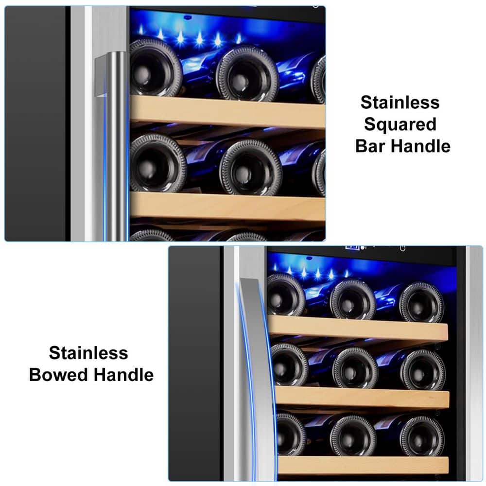 Introducing our beautiful single zone wine cooler, a true masterpiece of sophistication and functionality. Featuring dazzling blue LED lighting, two different styles of door handle options and a huge capacity of 30 bottles of fine wine, this wine cooler will take your wine collection to new heights. The double glass doors are both insulated and provide a clear view of the bottles, while a safety lock ensures that the bottles are kept secure. The front airflow, compressor and fan system ensures optimal temperature control, preserving the flavors and aromas of your favorite wines.The 240° door opening angle allows for easy access to contents, and the adjustable, sturdy oak shelves provide flexible storage for bottles of all sizes. Crafted from stainless steel, this wine cooler is elegant and durable. Enhance your home decor and impress your guests with this exceptional single-zone wine cooler that allows you to savor your wine.