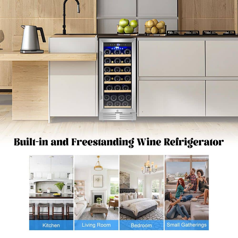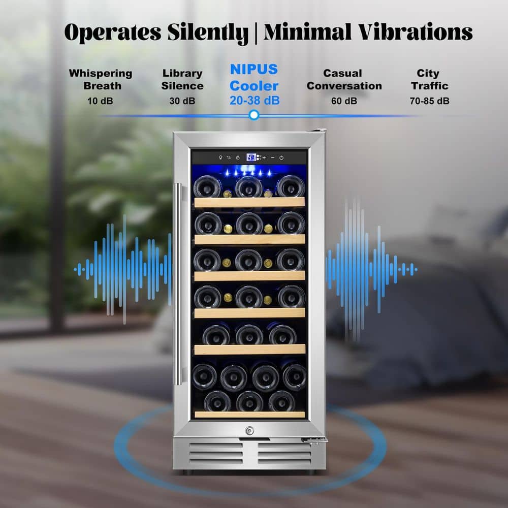 Nipus 15 in. Built-In Single Zone 30-Bottle Wine Cooler in Silver with Child Safety Lock and Blue LED Interior Lighting