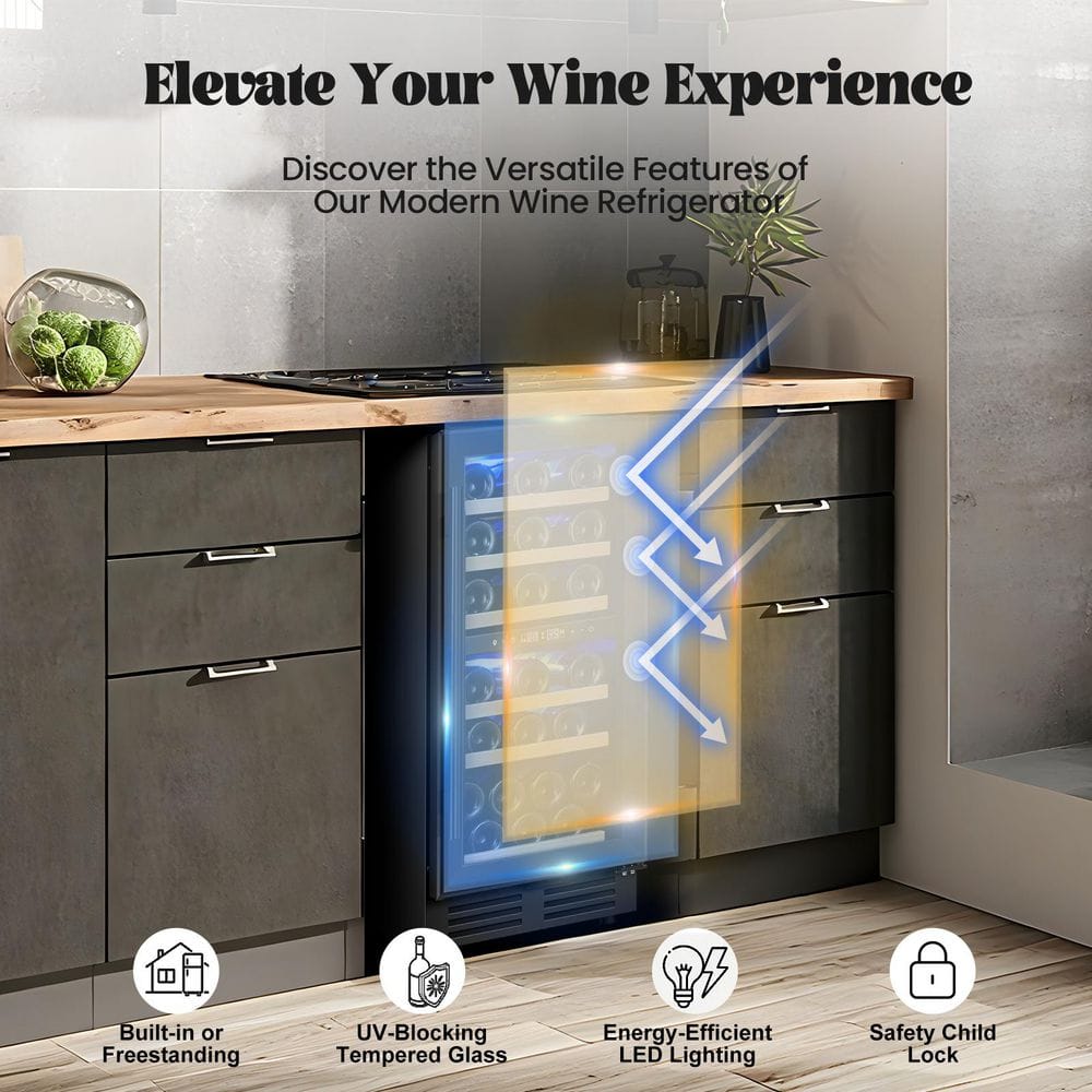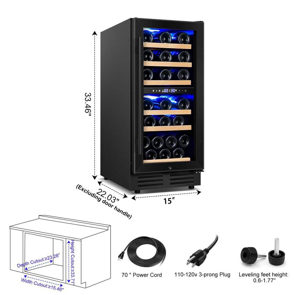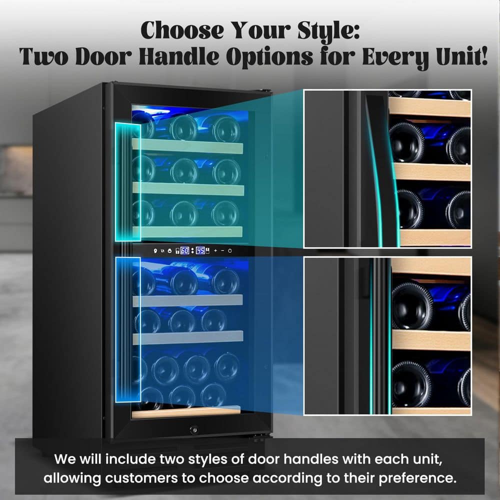 Elevate your wine storage with this sleek black dual-zone wine cooler, designed for both built-in and freestanding use. With the capacity to hold up to 30 bottles, this cooler features two distinct temperature zones, allowing you to store red and white wines at their optimal temperatures. The stunning blue LED lighting showcases your collection, while the stylish black finish adds a modern touch to any room. Whether you're a casual enthusiast or a serious collector, this wine cooler keeps your favorites perfectly chilled and ready to enjoy. Upgrade your home bar or kitchen today and experience the perfect blend of style and functionality.
