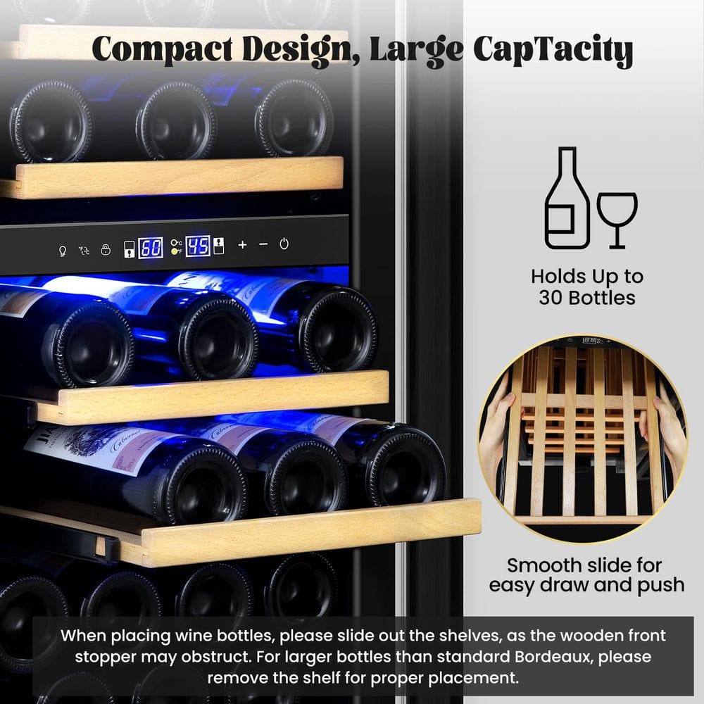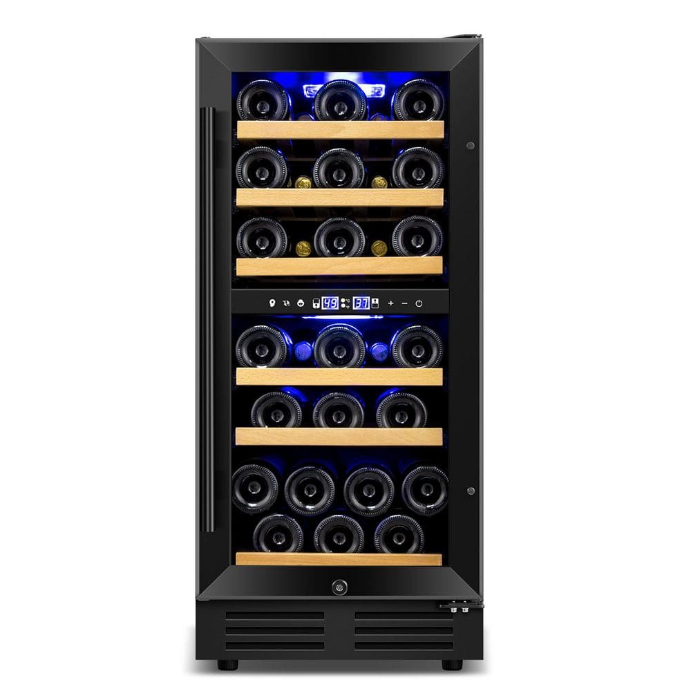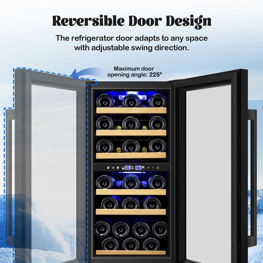 Nipus 15 in. Dual Zone 30-Bottle Reversible Door Wine Cooler in Black with 3 Removable Beechwood Shelves Auto Blue Lighting