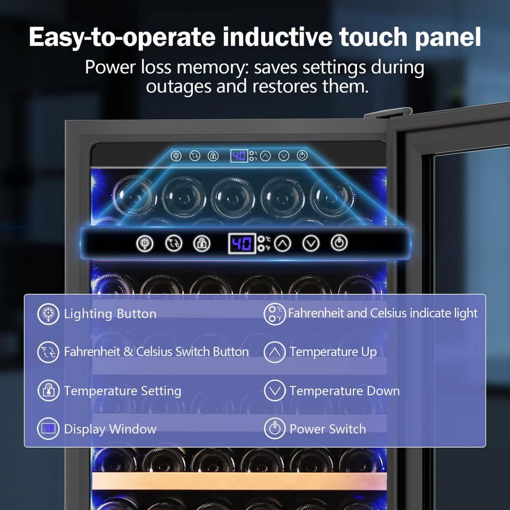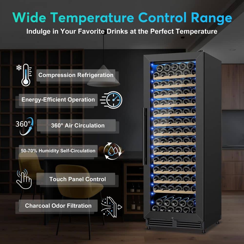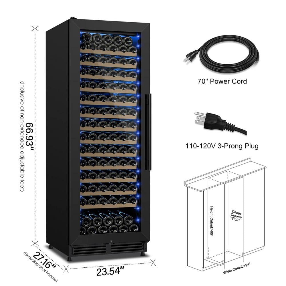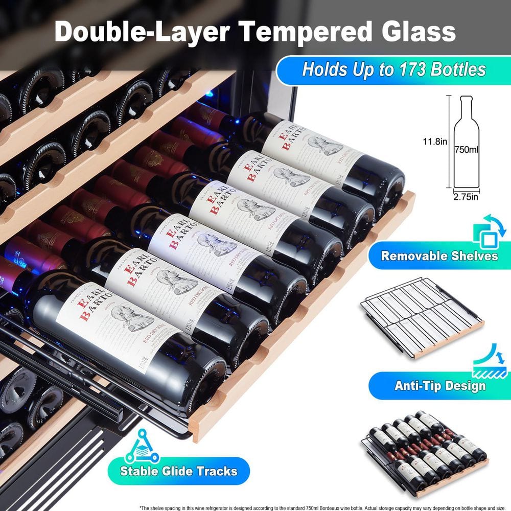 Introducing our extraordinary 24 in. wine cooler, a true masterpiece designed to enhance your wine storage experience. With the ability to hold up to 173-bottles of wine, this wine cooler is an example of luxury, style and functionality. Immerse yourself in a world of fine wine as we unveil the wine cooler's distinctive features. The single-zone design ensures stable storage conditions for your precious wines, while the 14 easily removable and installable beech metal shelves provide easy organization and customization. Accommodating wine bottles of all sizes and shapes, it's easy to create a stunning display for your collection. Take control of your wine cellar with our temperature conversion feature that allows you to seamlessly switch between Fahrenheit and Celsius settings. Our wine coolers operate at as low as 38-decibels, so you can enjoy a peaceful environment. Double UV glass doors protect your wine from harmful UV rays, and blue LED lighting adds a touch of elegance to your wine display. A front ventilation system ensures proper airflow, and a high-efficiency compressor and fan ensure rapid cooling and temperature stabilization. Our extraordinary 24 in. wine cooler combines sophistication and functionality to immerse you in the world of fine wine. Enhance your wine storage, showcase your collection, and enjoy the pleasure of savoring a perfect bottle of wine at the perfect temperature.
