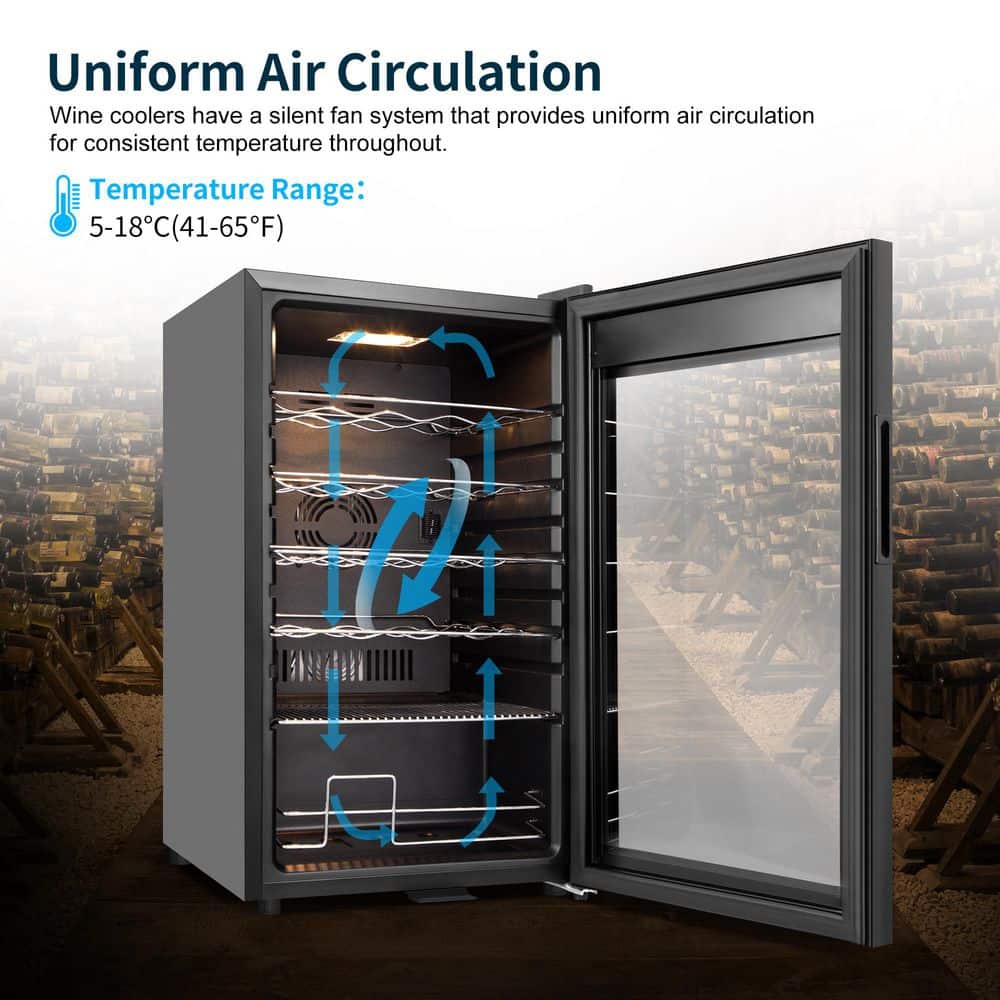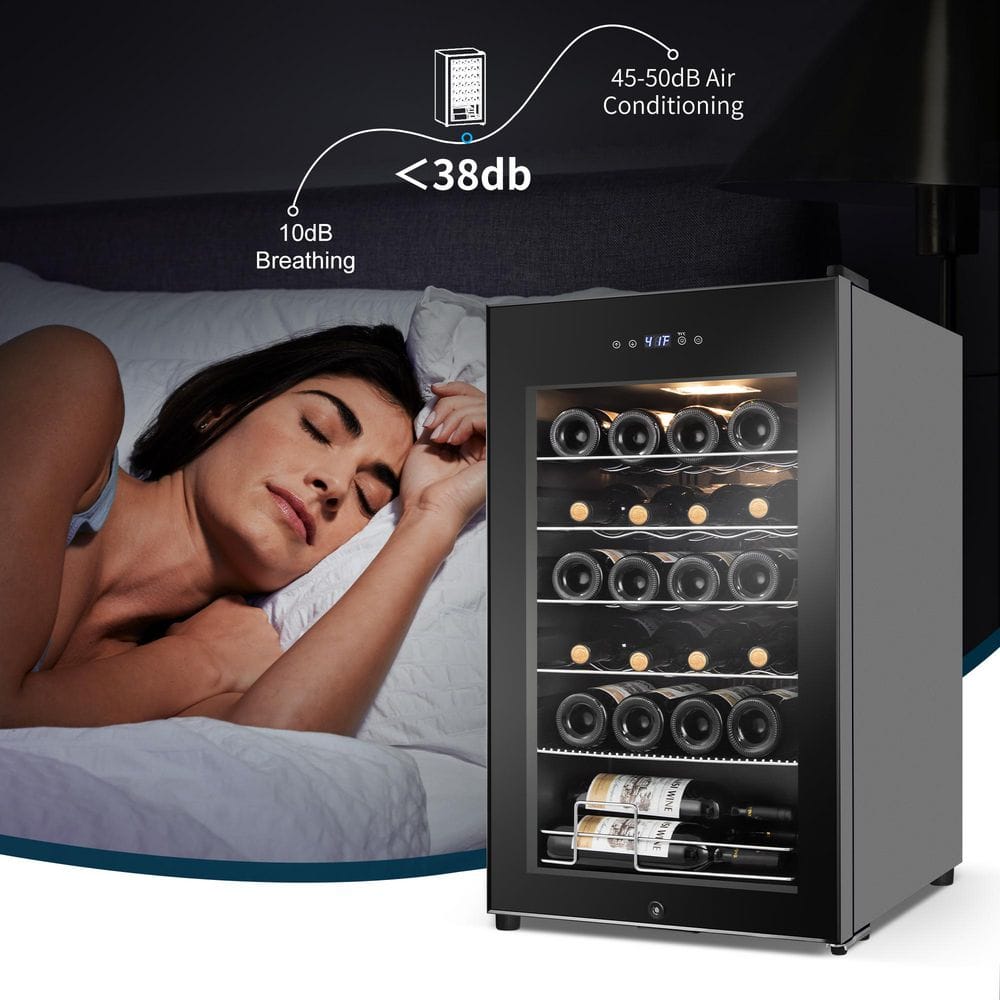 The 24-bottle wine fridge offers compact yet efficient storage for your wine collection, featuring 5 removable shelves for easy access and organization. Equipped with advanced compressor cooling technology and cooling fans, this wine cooler ensures a stable and powerful cooling environment, perfect for preserving your wine. Operating at less than 40 dB, it runs quietly without disturbing your rest or work, while its automatic defrosting function maintains consistent temperatures for each bottle. The double LOW-E glass door provides thermal insulation, high clarity, and frost-free visibility, beautifully showcasing your wine collection under soft interior lighting. Combining elegance and functionality, this 17-inch mini wine refrigerator is a stylish and space-saving solution, ideal for homes, offices, dormitories, RVs, and more.