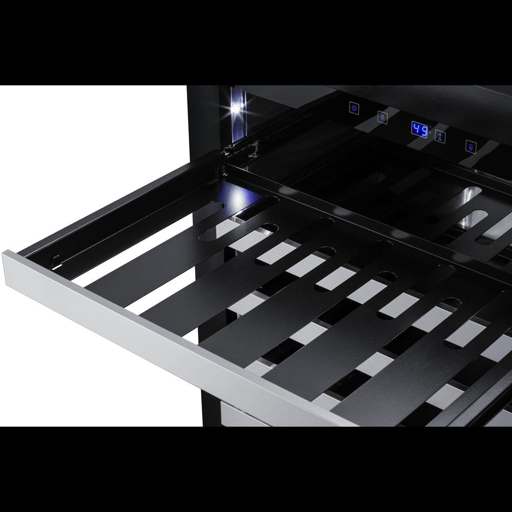 ASDW2412 is a 24 in. wide 33-bottle single zone wine cellar sized under 18 in. deep. It comes in a 32 in. height to fit under lower ADA compliant counters, with adjustable legs and a sliding kickplate cover that also allows you to raise the overall height up to 34 in. to fit standard counter spaces. The front-breathing system allows built-in installation, while the fully finished black cabinet also allows freestanding use. Seamless stainless steel trim blends smoothly into the double pane tempered glass door for an elevated look, with a professional stainless steel handle included. This unit has a sealed rear and right angle cord for a better fit. Inside, the ASDW2412 features stainless steel construction for improved durability and sanitation. White LED lighting located in the side walls provides elegant display conditions, with dimmable levels that let you create the perfect presentation. The digital control panel lets you adjust the temperature between 41°F and 64°F to accommodate red, white, or sparkling wine. Our uniquely designed steel shelves in a jet black finish extend smoothly on ball-bearing glides, with stainless steel front trim to complete the classic look. Fan-forced cooling ensures even temperature distribution and fast temperature recovery. Additional features include an open door alarm, high temperature alarm, and Sabbath mode setting that lets you disable some of the electrical elements during periods of observance.