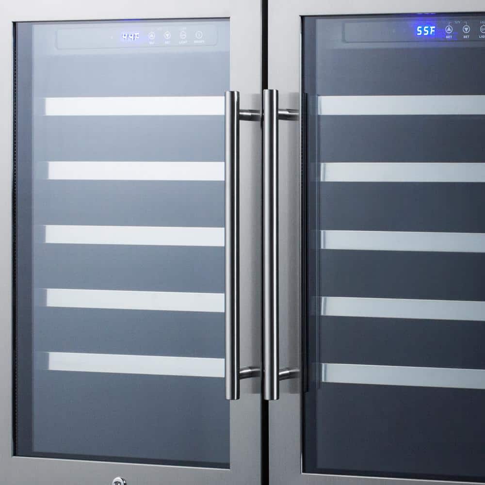 SUMMIT's collection of built-in undercounter wine cellars offers quality storage with user-friendly convenience and elegant style.The SWC3668 is a 36 in. wide wine cellar designed for built-in installation under counters. The fully finished black cabinet also allows freestanding use. This unit includes two seamless stainless steel trimmed glass doors with a unique French door swing. Both include factory installed locks for added security and professional handles to finish the modern look. Two separate zones feature independent digital thermostats, letting you chill white and sparkling wine in one section while preserving reds under warmer temperatures in the other. Both zones include five wooden shelves in a jet black finish with stainless steel trim, as well as slotted floors to accommodate champagne bottles. The interior can store up to 68 standard 750ml Bordeaux bottles. Alternatively, you can fit up to 56 wider "Burgundy" style bottles (often used for Chardonnay and Pinot Noir). Recessed LED lighting offers an attractive view to let you display your wine collection in style. With a professional look and innovative design, SUMMIT SWC3668 is a unique addition to any home. For this unit sized for lower ADA compliant counters, see the SWC3668ADA.