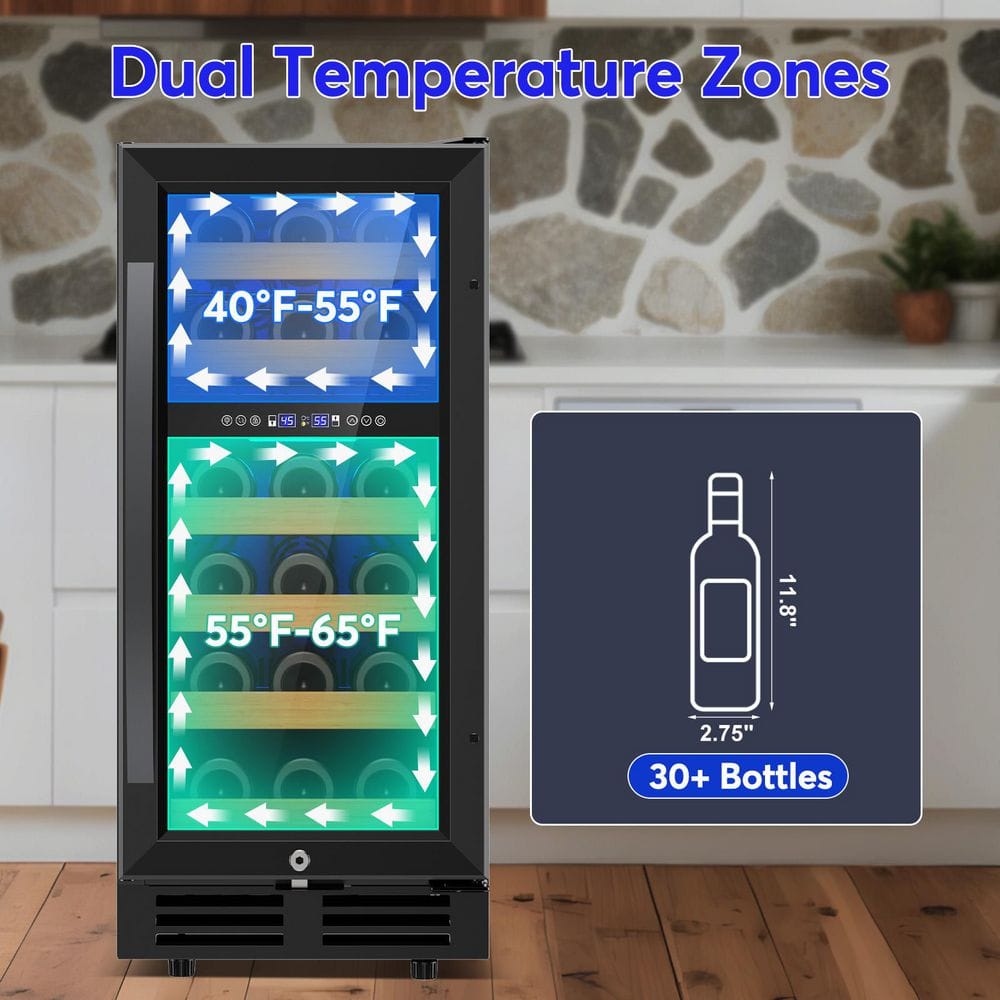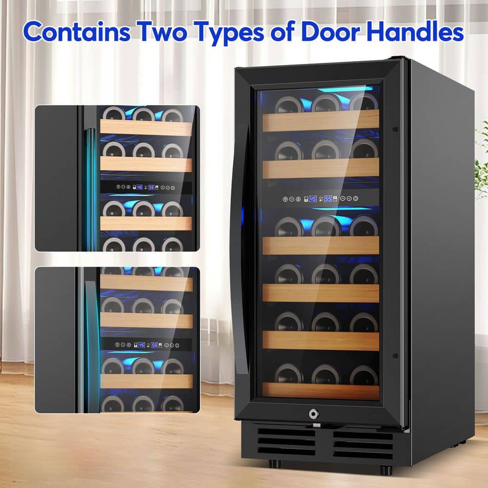 TITTLA 15 in. Dual Zone 30 Bottles Wine Refrigerator w/Reversible Door Hinge Built-in Wine Cooler with 2 Door Handles in Black