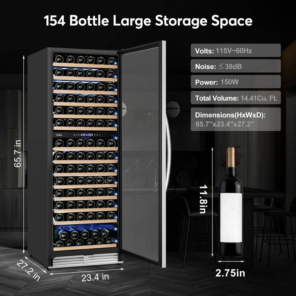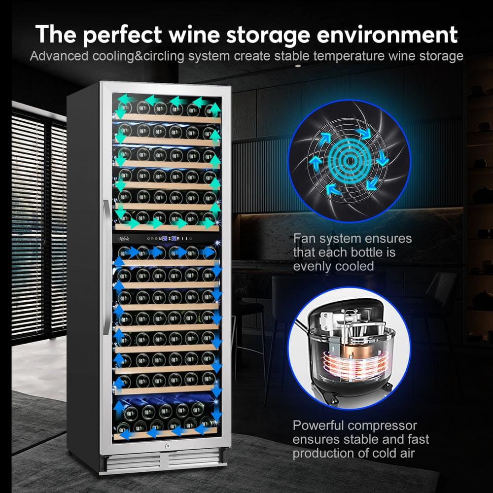Introducing our Dual Zone Wine Fridge, a unique solution for hassle-free wine storage. This fridge accommodates diverse wine collections, even larger bottles like Champagne. The upper zone ranges from 40°F to 55°F, while the lower zone is between 55°F to 65°F, ensuring optimal storage for different wines.With a 154-bottle capacity and 14 beech wooden shelves, you can store your wines securely without any shake or damage. The advanced compressor and fan cooling system distribute cold air evenly, maintaining consistent temperatures across all shelves for better wine preservation.The Temperature Memory Function protects your wines from sudden power-off situations by restoring the last set temperature when restarted. Enjoy peace of mind with our 12-month warranty and lifetime technical support.Upgrade your wine storage experience with our Dual Zone Wine Fridge and savor the best taste in every bottle. Cheers to exceptional wine moments!