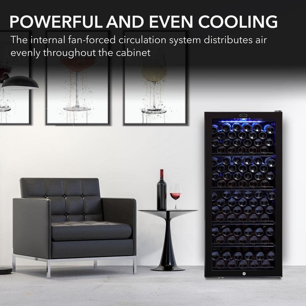 Ideal for the aspiring wine enthusiast or the seasoned collector, your portfolio can be safely and optimally stored in the Whynter FWC-1201BB Freestanding Wine Cabinet Refrigerator with Lock. This Whynter single zone wine freestanding storage system can hold up to 124 standard 750 ml wine bottles, an perfect storage and display unit for an expanding collection. Equipped with a strong fan-circulated cooling system and LED lighting the unit includes features to enhance your experience each time you reach for a bottle.