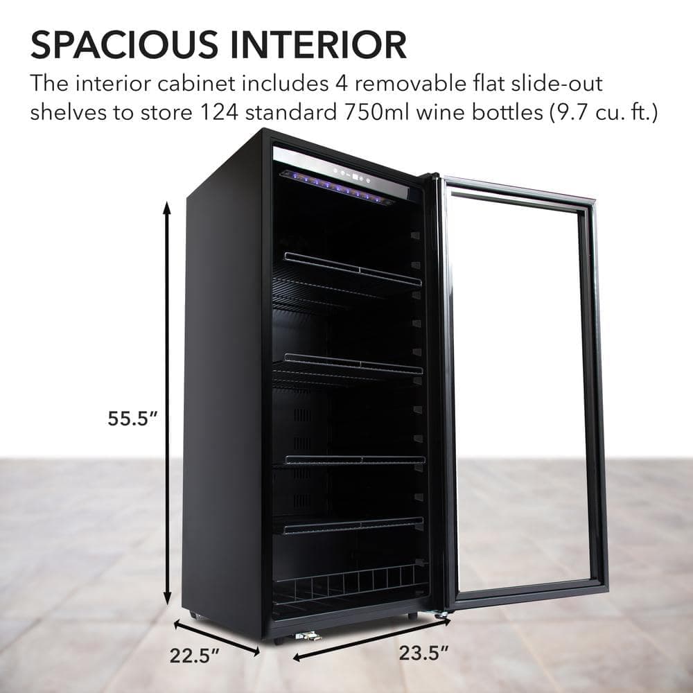 - Holds up to 124 wine bottles with 4 slide-out shelves