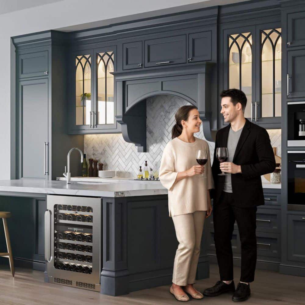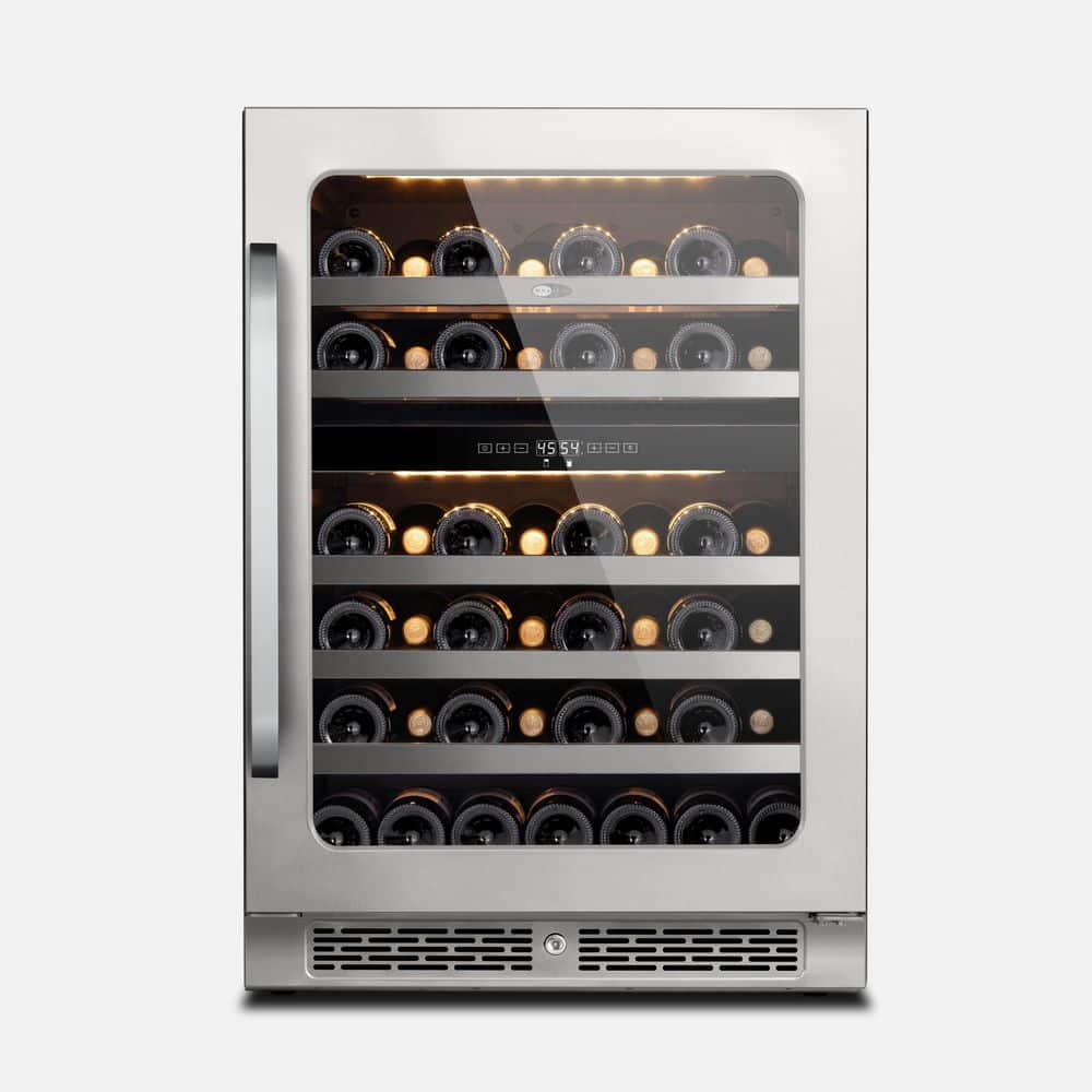 The Whynter BSR-046DW 24 in. Built-In Dual Zone Wine Cooler provides premium storage for up to 46 bottles. With independent temperature zones, you can store reds and whites at their ideal conditions in one unit. The sleek black cabinet and stainless steel reversible door complement modern kitchens and bars, while the undercounter design offers a seamless built-in look. A digital control panel with LED display allows precise temperature adjustment, and the built-in lock secures your collection. A carbon filter helps maintain air quality inside the cabinet, ensuring wines are preserved at their best.