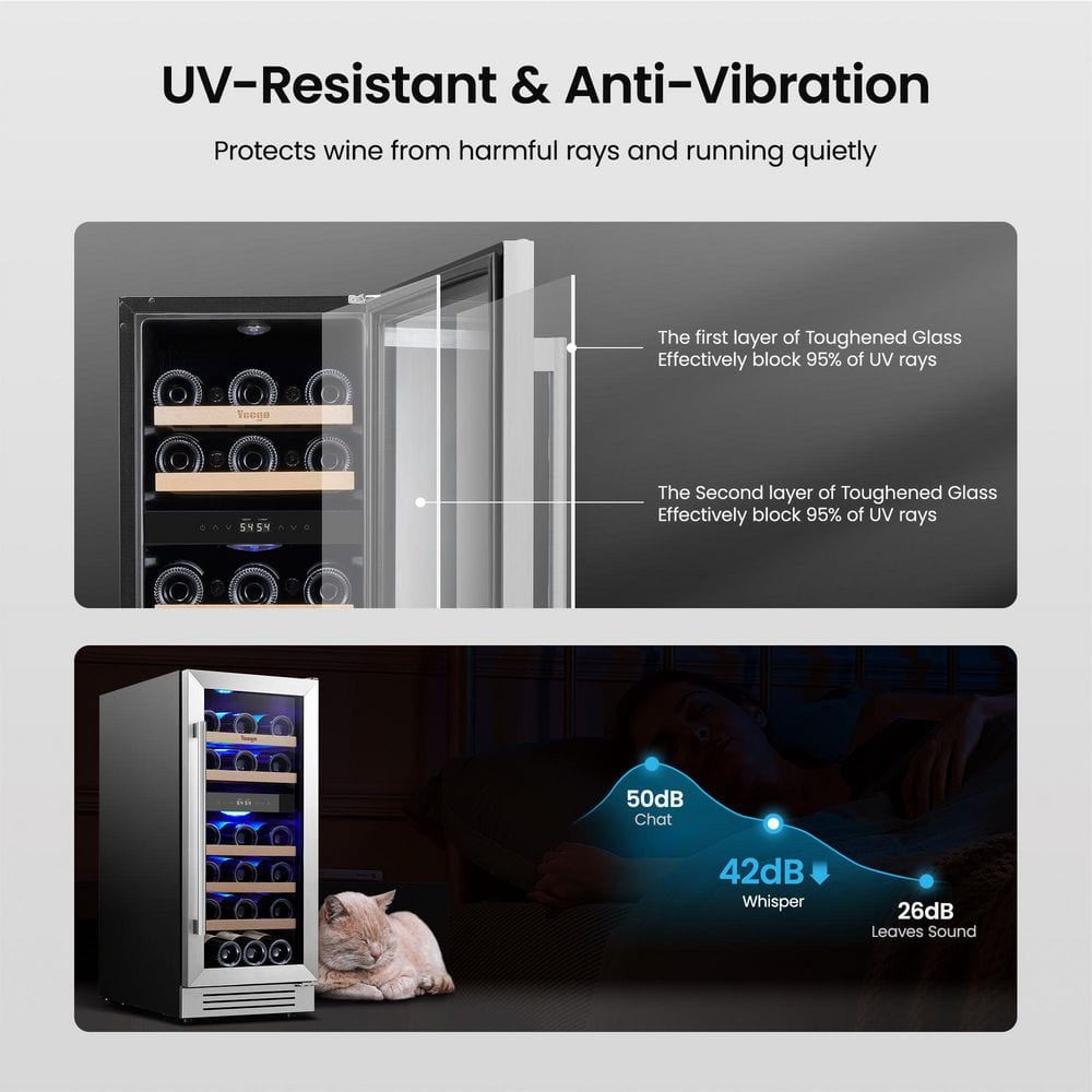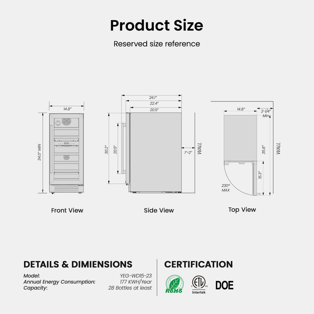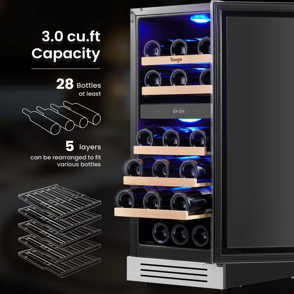 Yeego dual zone 15 in. wine fridge, under counter/built-in 28-bottle wine cooler refrigerator with upgraded compressor which fits large bottles. The dual-zone control makes it suitable for virtually any type of wine. With 5 removable premium wire-wood shelves that slide smoothly and are strong enough to hold your bottles. This wine refrigerator features automatic defrosting and an active charcoal filtration system to ensure air purity and maintain an odor-free cabinet for your wine storage. with intelligent and sensitive digital control that can be adjusted from 40-65°F to provide you with the best taste. Yeego wine cooler is the best Christmas gift for the family.