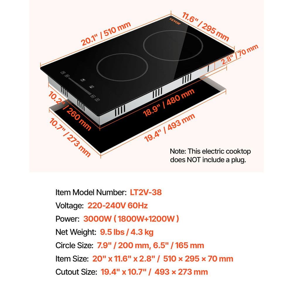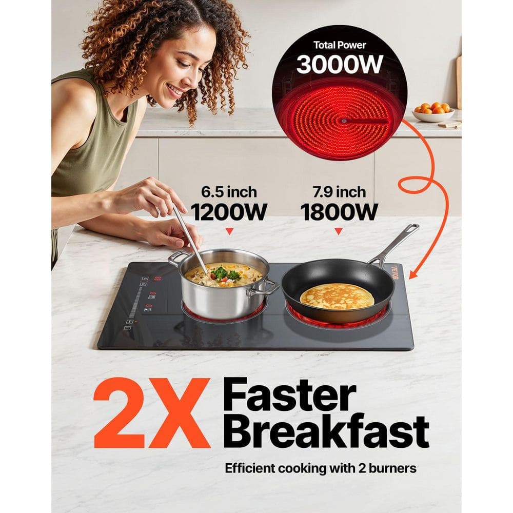 Make cooking easier with this Vevor radiant cooktop. It features two cooking zones that produce 3000W of power. For convenient operation, it comes with sensor touch controls with nine heating levels and a timer function. A child lock, overheat protection, auto shut-off and a residual heat indicator deliver safety. The heat-proof glass cooktop is easy to clean.