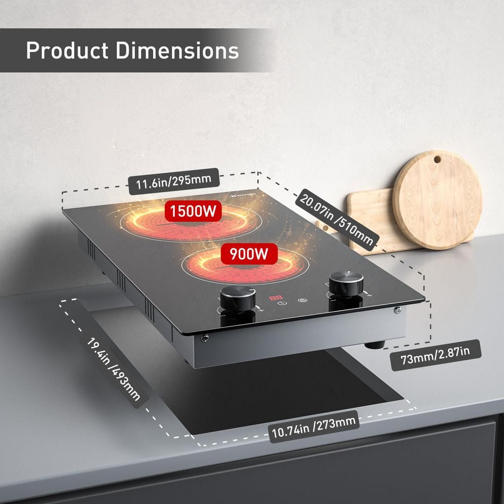 Designed for versatile home cooking, this 2-burner radiant cooktop combines power, precision, and convenience in a sleek, space-saving form. The 1500W and 900W heating zones offer 9 adjustable levels for everything from a gentle simmer to a rapid boil, while the smooth knob controls make adjustments effortless. Its durable ceramic glass surface not only resists heat and scratches but also wipes clean in seconds, keeping your kitchen looking fresh. With the included 12 in. plug, installation is quick-whether built into your counter or used as a portable unit-and it's compatible with a wide range of cookware. Safety comes built-in with a child lock, overheating protection, auto shut-off, and a hot surface indicator, so every meal is made with peace of mind.