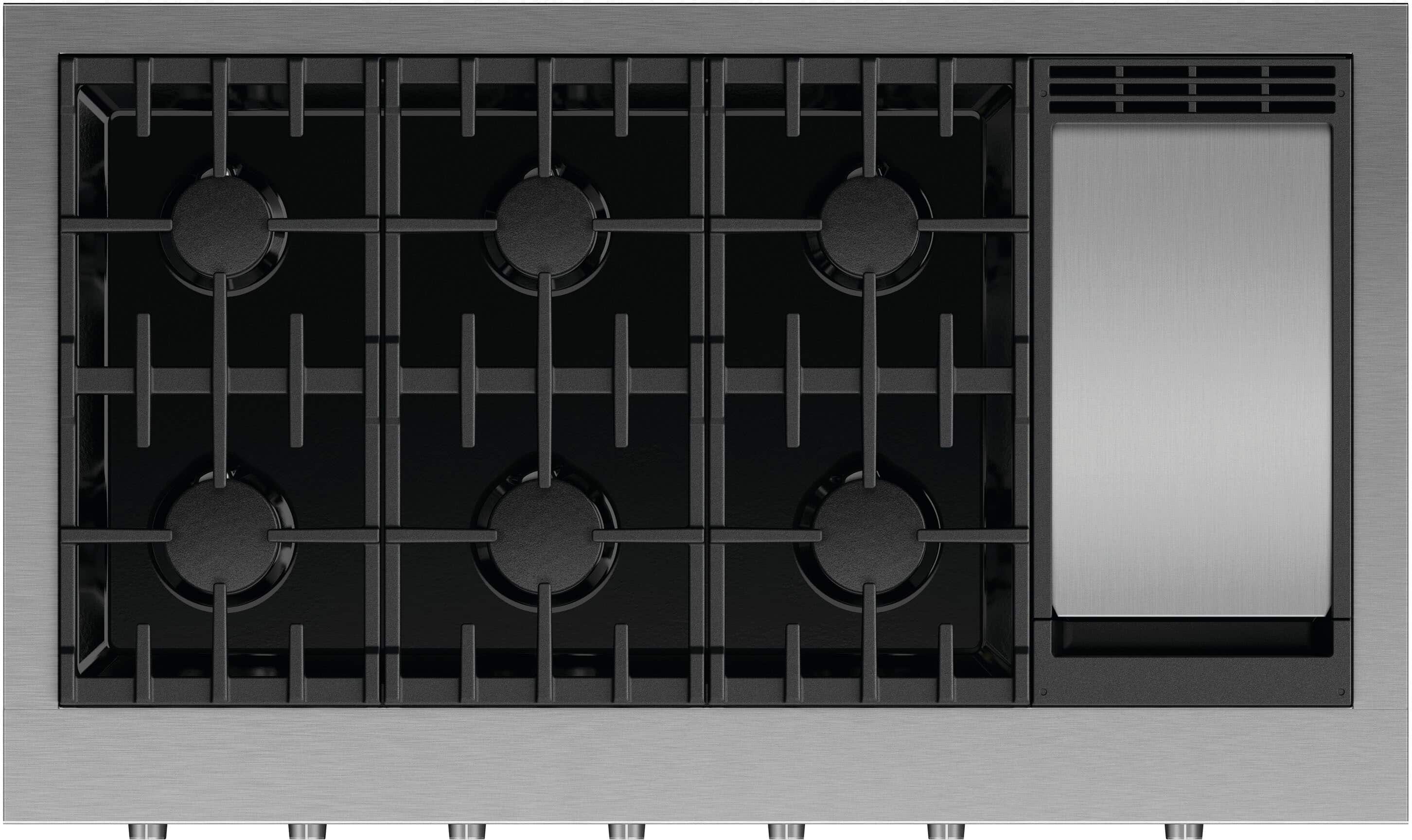 A powerful six burner rangetop with Professional styling and the additional cooking flexibility of a stainless steel griddle.