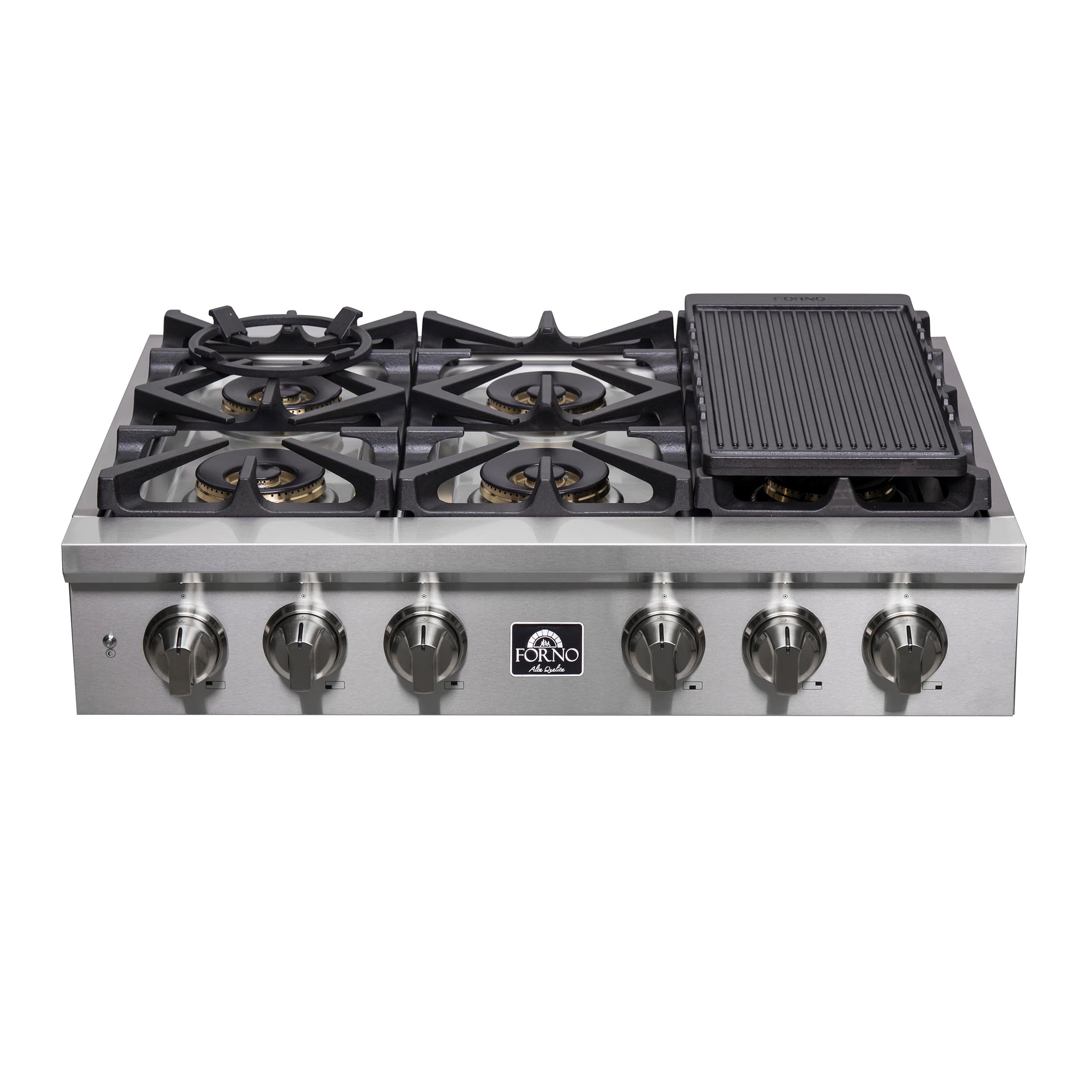The FORNO ALTA QUALITA 36” Pro-Style Gas Rangetop has a versatile cooktop configuration with 6 sealed dual brass burners totalling 120,000 BTUs to handle any culinary challenge. Heavy duty continuous cast iron grates simplify moving pans around without lifting them off the surface and contoured Zinc Control Knobs allow easy control of the burners for precision gas cooking. Includes Auto-ignition, Griddle, Wok-Ring and LP conversion Kit. Heavy-duty 304 stainless steel cleans easily and beautifully complements other Forno appliances to fit any kitchen design.