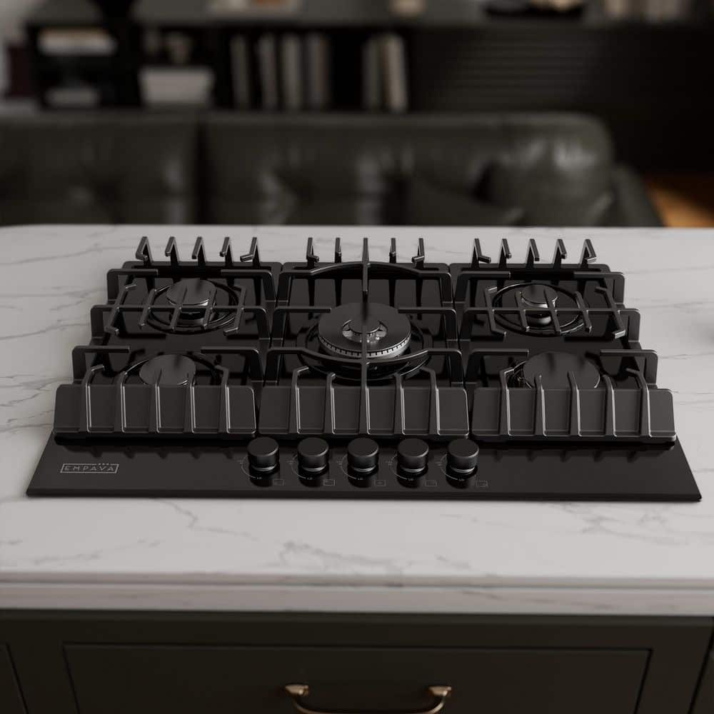 Make cooking easier with this CSA-certified Empava 30-in. five-burner cooktop. It comes with five sealed gas burners including a 20,000-BTU quick boil burner. Black tempered glass gives it style, adding a modern look to any counter.