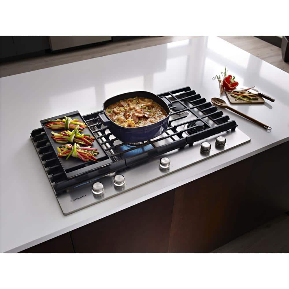 KitchenAid 36 in. Gas Cooktop in Stainless Steel with 5 Burners Including a Multi-Flame Dual Tier Burner and a Simmer Burner