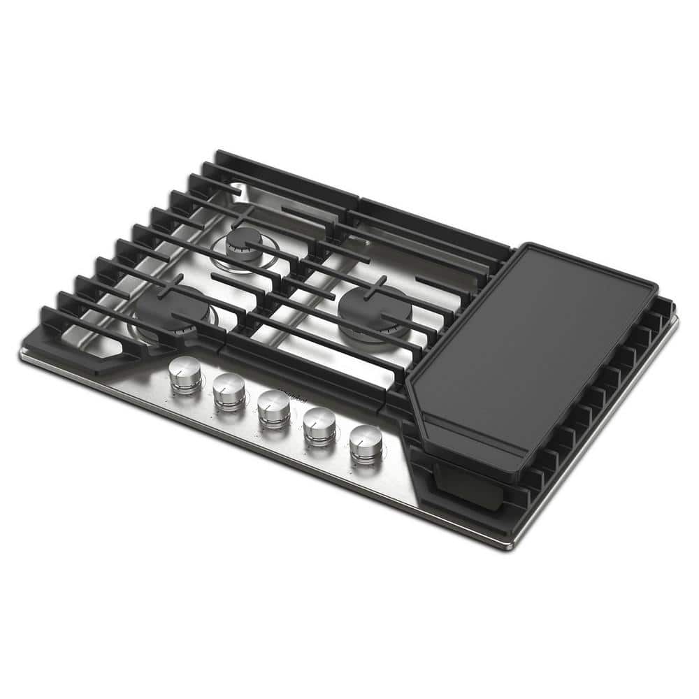 Whirlpool 30 in. 5 Burners Recessed Gas Cooktop in Stainless Steel with 2 in. 1-Hinged Grate to Griddle
