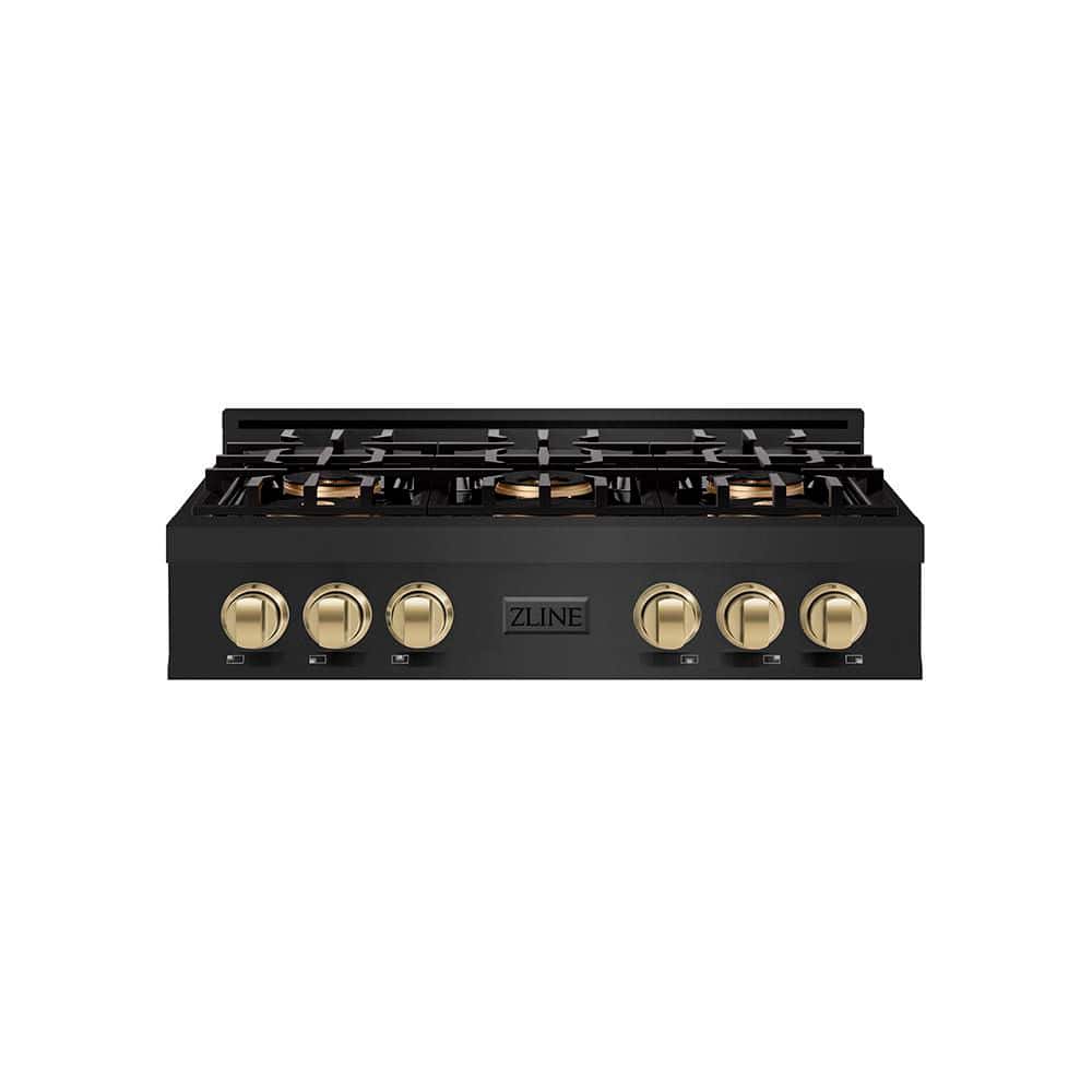 ZLINE Kitchen and Bath Autograph 36 in. Classic Gas Rangetop with 6-Burner DuoPro Cooktop in Black Stainless Steel and Champagne Bronze Accents