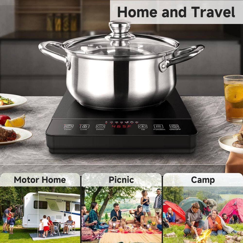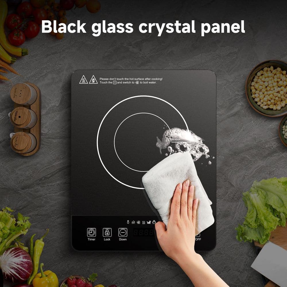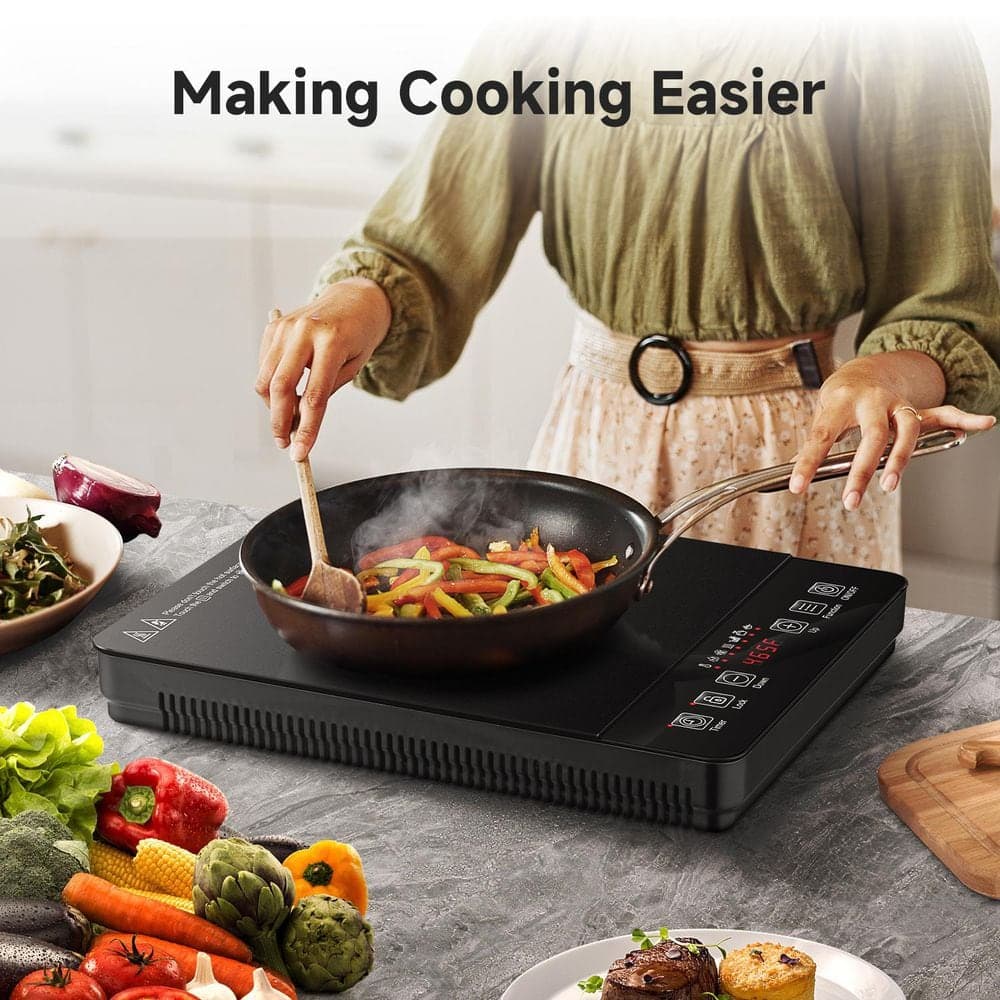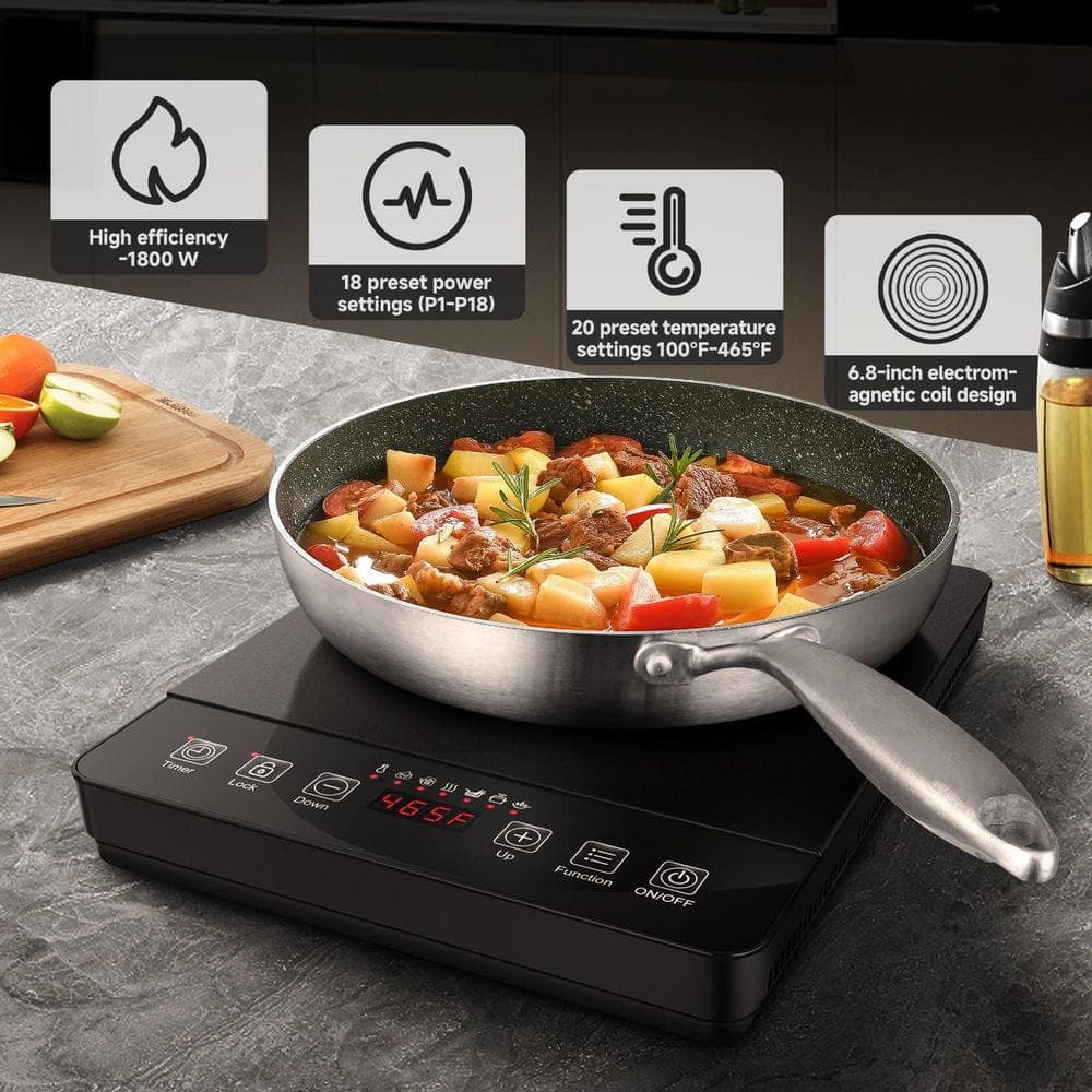 Elevate your cooking with our powerful 1800-Watt induction cooker, designed for those who demand both performance and precision. With 20 adjustable power levels (P1-P20) and 20 temperature settings from 120°F to 465°F, this induction cooktop offers unmatched control for everything delicate melting to high-heat searing. The advanced 6.8 in. electromagnetic coil delivers rapid, even heating that reduces cooking time while improving consistency and versatility across all your favorite dishes. Your safety is always a priority-this induction stove includes a child safety lock, residual heat indicator, and automatic pan detection, along with over-temperature protection, voltage alerts, and a 4-hour timer for worry-free operation. Simplify meal preparation with intuitive 1 -touch presets for Boil, Hotpot, Stew, Keep Warm, and Stir-fry, making it effortless to achieve perfect results every time. Lightweight and portable at under 5kg, this induction hob is ideal for small kitchens, travel, or outdoor use, and accommodates pots from 12cm to 26cm. The sleek black glass ceramic surface resists stains and wipes clean easily, while the sturdy base ensures stability. For lasting performance, we recommend using flat-bottomed cookware. Discover a new level of efficiency, safety, and convenience with this all-in-one induction cooktop.
