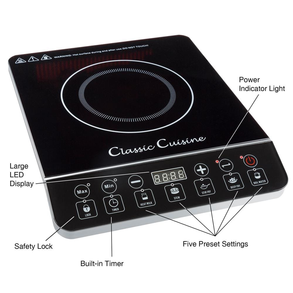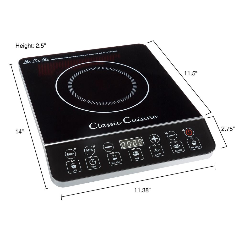 Equip your home, RV, camper, or dorm room for fuss-free cooking with this 1800-Watt Induction Cooktop Hot Plate by Classic Cuisine. Compact, lightweight, and simple to store, this electric stove top has 10 power settings ranging from 200 to 800-watts with 140 to 460-degrees Fahrenheit temperatures, allowing you to do everything from warm up canned goods to cooking complete meals on this single induction burner. A safety lock and automatic shutoff feature that prevents heating when pans are improperly placed on the induction cooktop or are removed ensures worry-free use of this energy-efficient electric cooktop that uses no flames, gas, or heating elements.