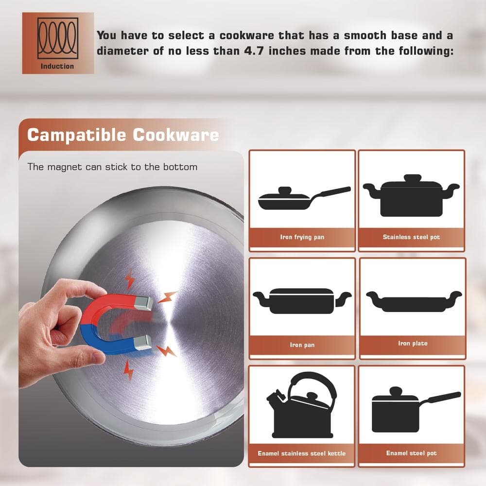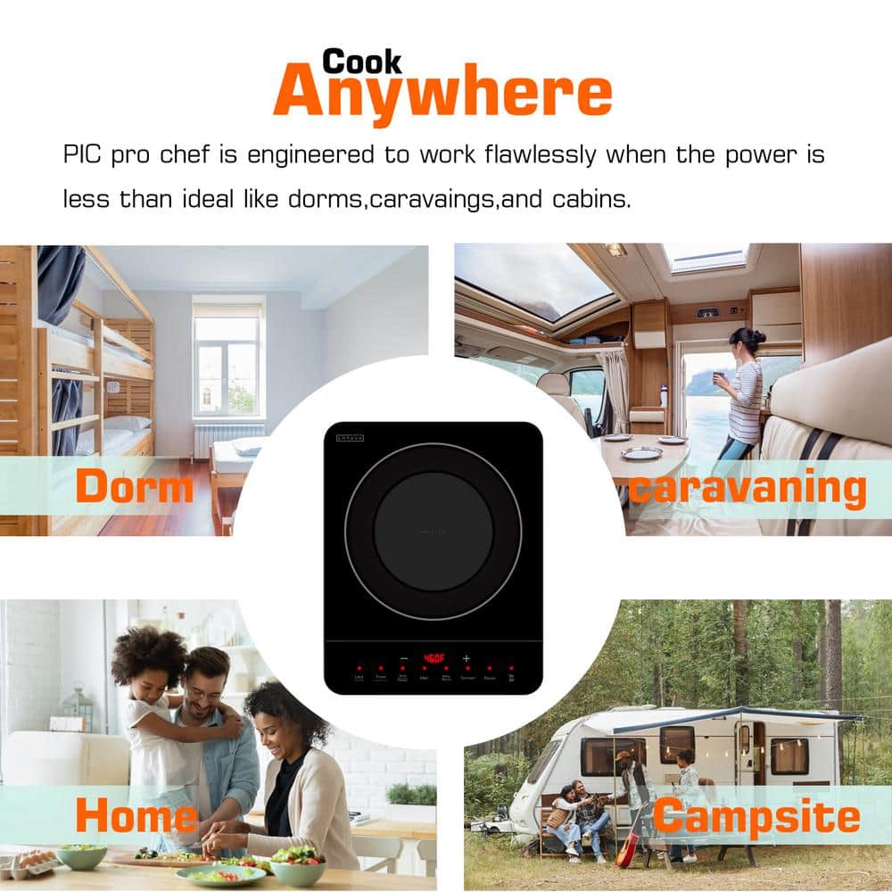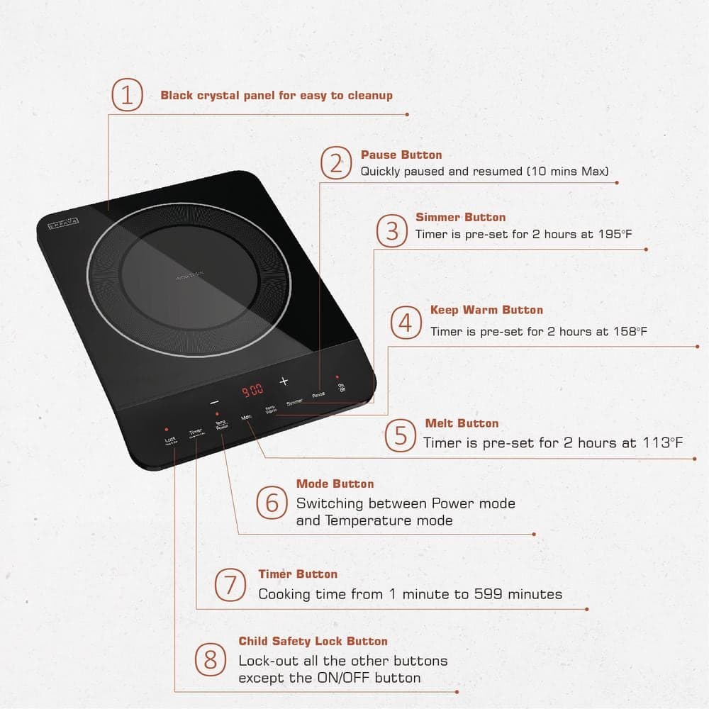 The 11 in. Portable Single Heating Element 1800-Watt Countertop Induction Cooktop is a perfect combination of style and practicality. Panel lock safety feature gives you peace of mind, and also makes it easier to clean the surface without pressing unwanted buttons. Low simmer allows for gentle cooking for even the most delicate of sauces and chocolate. Warming function maintains low temperature for extended period. Simmer is ideal for maintaining a Simmering Temperature (bring the pan to the boil), allowing you to cook food for long periods. Ideal for long-cooking recipes (sauces, soups, stews, etc.,) at an optimal Simmer. Pause is a safety feature with the help of which the program settings can be paused, meaning cooking can be paused, and then when pressed again, it will resume the cooking process. This compact, lightweight, easy-to-store induction cooktop is perfect for outfitting your home, RV, camper or dorm.