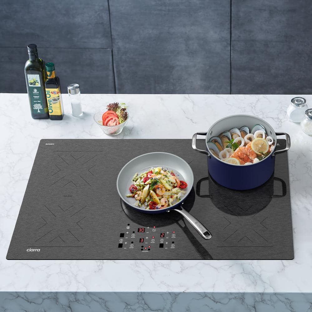The JEREMY CASS BigChef induction cooktop comes in 2 options-4 burner elements and 5 burner elements-and has an always-cool cooking surface. It is compatible with any cookware that has a magnetic base and a magnetic permeability diameter of 4.7 to 14.2 in. This allows for a wide range of pots and pans, ensuring versatility in your cooking. The ceramic glass plate offers a smooth, sleek design that enhances kitchen aesthetics. So recipes are followed more efficiently, meals are made quickly, and cleanup happens easily.