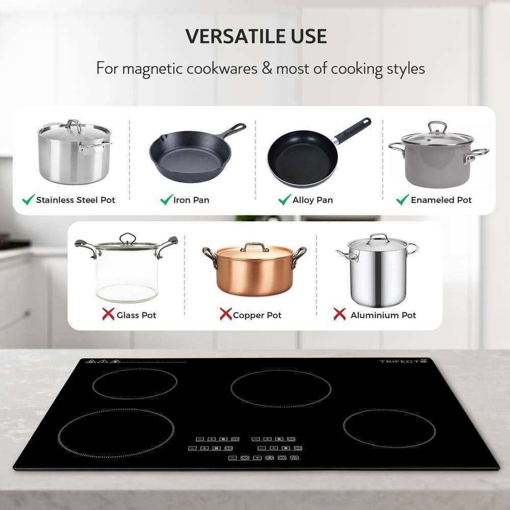 The Trifecte 30 in. 4-element Induction with certified is a perfect combination of style and efficiency. Featuring 4-powerful cooking zones and multiple heat levels that range from simmering to rapid boiling, our induction offers unparalleled versatility for all your culinary endeavors. Sleek black glass-ceramic surface and built-in design, ensuring durability and easy maintenance. With compatibility for most stainless steel and cast iron cookware, you can rest assured that this induction hob will seamlessly fit into your kitchen setup. Let this Trifecte Induction Cooktop bring more fun, efficiency, and convenience to your cooking experience.