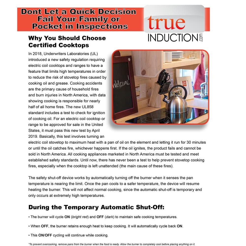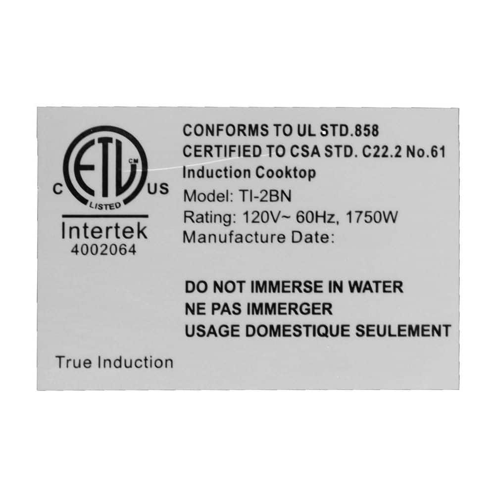 The TI-2BN can be installed directly into the countertop of your boat, RV, camper, outdoor kitchen, or apartment, or it can simply be used as a portable countertop unit. With its compact width, the unit is perfect for tight-fitting narrow spaces. It has no flame, no fumes, built-in safety components, and official certifications such as UL858. True Induction's high-efficiency cooktop utilizes magnetic-based technology that heats the ferrous metal in the cookware rather than the cooking surface itself. The induction cooking process is extremely energy efficient and can boil water in just 1-2 minutes. Induction-compatible cookware includes stainless steel, cast iron, and enamel-coated steel.