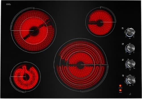 Bring out your culinary skills with this 30-inch Jenn-Air electric cooktop. It has four radiant elements, including triple and dual elements that accommodate assorted cookware and provide a variety of heat levels, and the combined 8500W output delivers powerful performance. The black stainless steel knobs of this Jenn-Air electric cooktop ensure precise control and complement its elegant black glass exterior.
