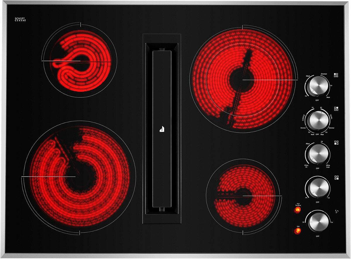 This Jenn-Air luxury electric radiant downdraft cooktop offers a sleek cooking surface with five radiant elements, which offer responsive performance. It also features the impressive JX3 downdraft ventilation system, which quickly and efficiently clears the air without a hood.