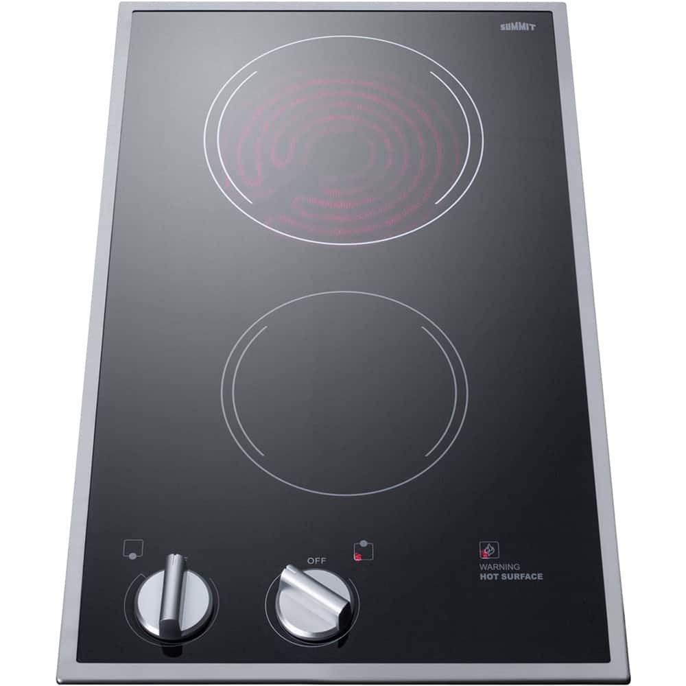 Prepare delicious meals with this Summit ceramic glass cooktop. The two electric burners provide fast heating, while the black EuroKera ceramic glass surface offers durability and easy cleanup. This Summit ceramic glass cooktop has front push-to-turn knobs for easy operation, and the residual heat indicator alerts you when the burners are hot for safety.