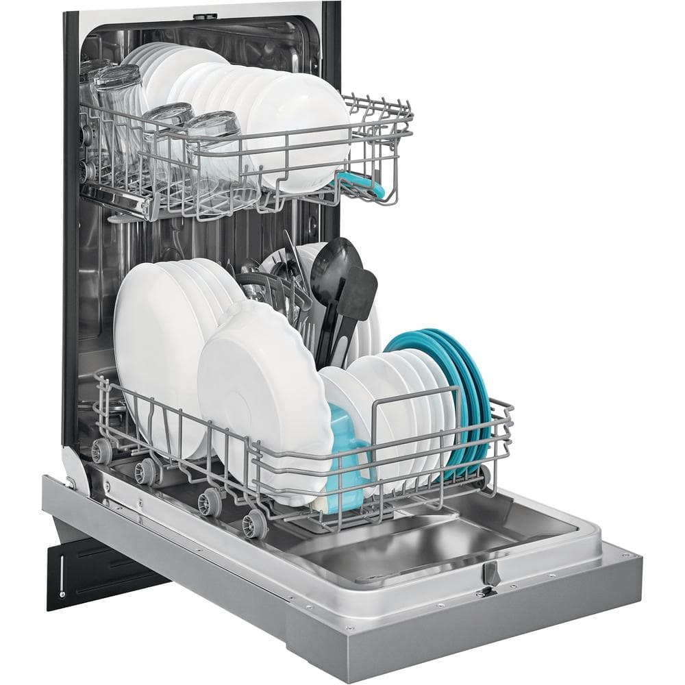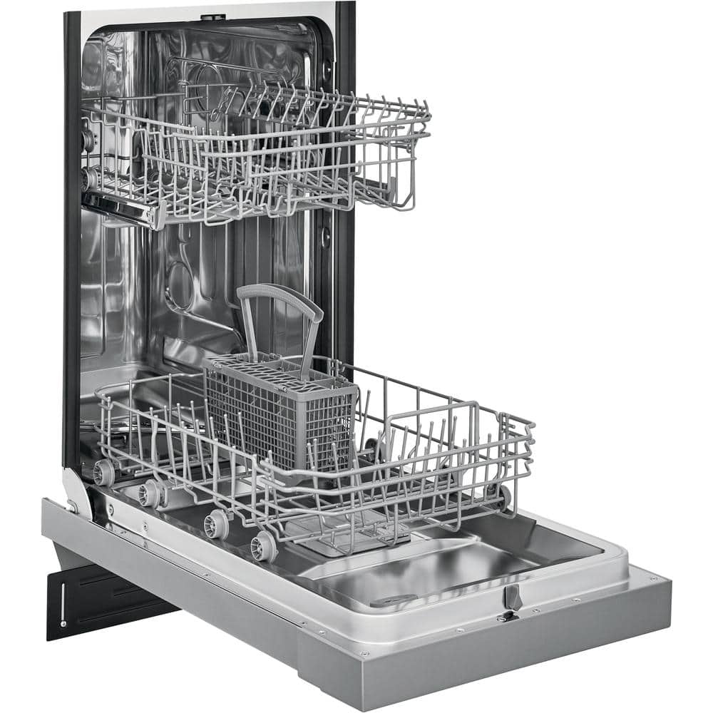 The Frigidaire 18 in. Built-In Dishwasher is ADA Compliant and features a dual spray arm system that delivers a thorough clean every time. Remove 99.9% of common household bacteria with the Sanitize Cycle, while the space saving design allows you to clean up to 8 place settings in one cycle. Featuring easy-to-use cleaning cycle options for your different cleaning needs including Energy Saver, Heavy Wash, and Rinse Only. Our top and bottom rack dual spray arm system gives you a thorough clean every time.