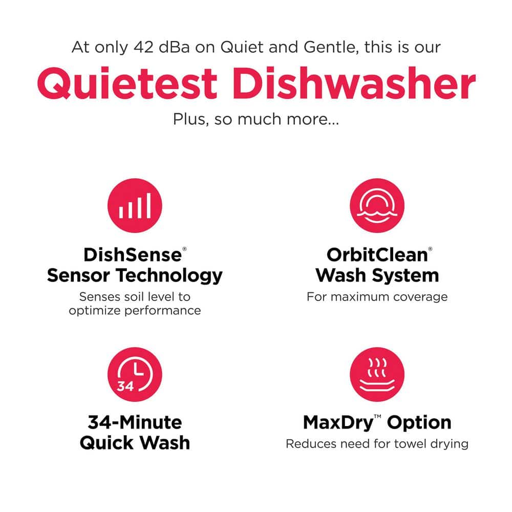 This 24" dishwasher offers a more complete clean with sensor technology that adjusts cleaning performance based on soil level, with an ultra-quiet 42 dBa operation. Get better cleaning results with our sensor technology that adjusts cleaning performance based on the soil level of your dishes. Get an enhanced dry with the MaxDry option, which raises the temperature and delivers better results that reduce the need for towel drying.