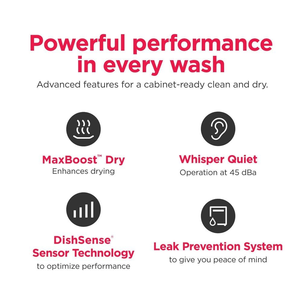 The Frigidaire Professional 24" Stainless Steel Tub Built-In Dishwasher with CleanBoost technology amplifies the power of your detergent by premixing it with water before it touches your dishes. Delivering powerful cleaning results and removing tough baked-on foods. This ultra-quiet (45 dBa) dishwasher also features MaxBoost dry and an Adaptive Quick Wash that adjusts resources and performance based on the soil level to deliver the fastest and cleanest quick wash in the industry.