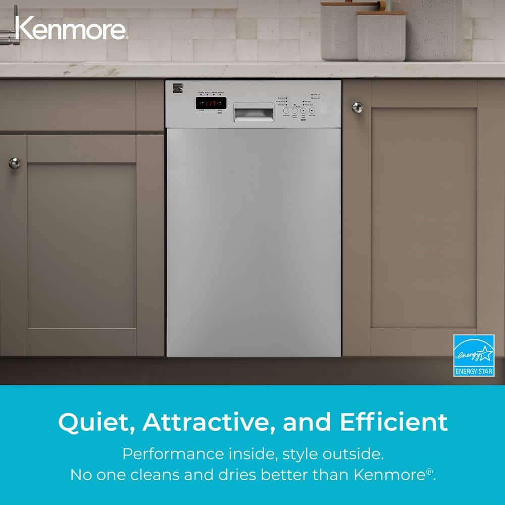 Get the cleaning power your dishes need with the Kenmore Built-In Dishwasher. This 18 in. dishwasher makes it easy to get the right wash for your load every time with SmartWash Cycle, which detects the amount of soil in the water and automatically adjusts the temperature, amount of water, and duration of the wash accordingly. Featuring UltraWash Plus and TurboDry systems, this dishwasher uses 3 spray arms while constantly filtering the wash water through the wash cycle and uses hot water to promote the condensation of moisture in the tub for ready-to-use, sparkling clean and dry dishes at the end of the cycle. The AccelaWash Option delivers clean dishes in less time without sacrificing cleaning power, and the Leak Detect System measures and monitors water flow at various points of the cycle to ensure problem-free dishwashing. Functional and attractive, the stainless steel tub resists food stains and retains heat for an optimal drying performance each cycle while also making for a stylish addition to any home kitchen. Operating at 45 dBA, this low-noise dishwasher offers ultra-quiet wash cycles to make it easy to enjoy after-dinner chats and clean up around the kitchen, and it's Energy Star Certified to help you save money while using less energy each cycle.