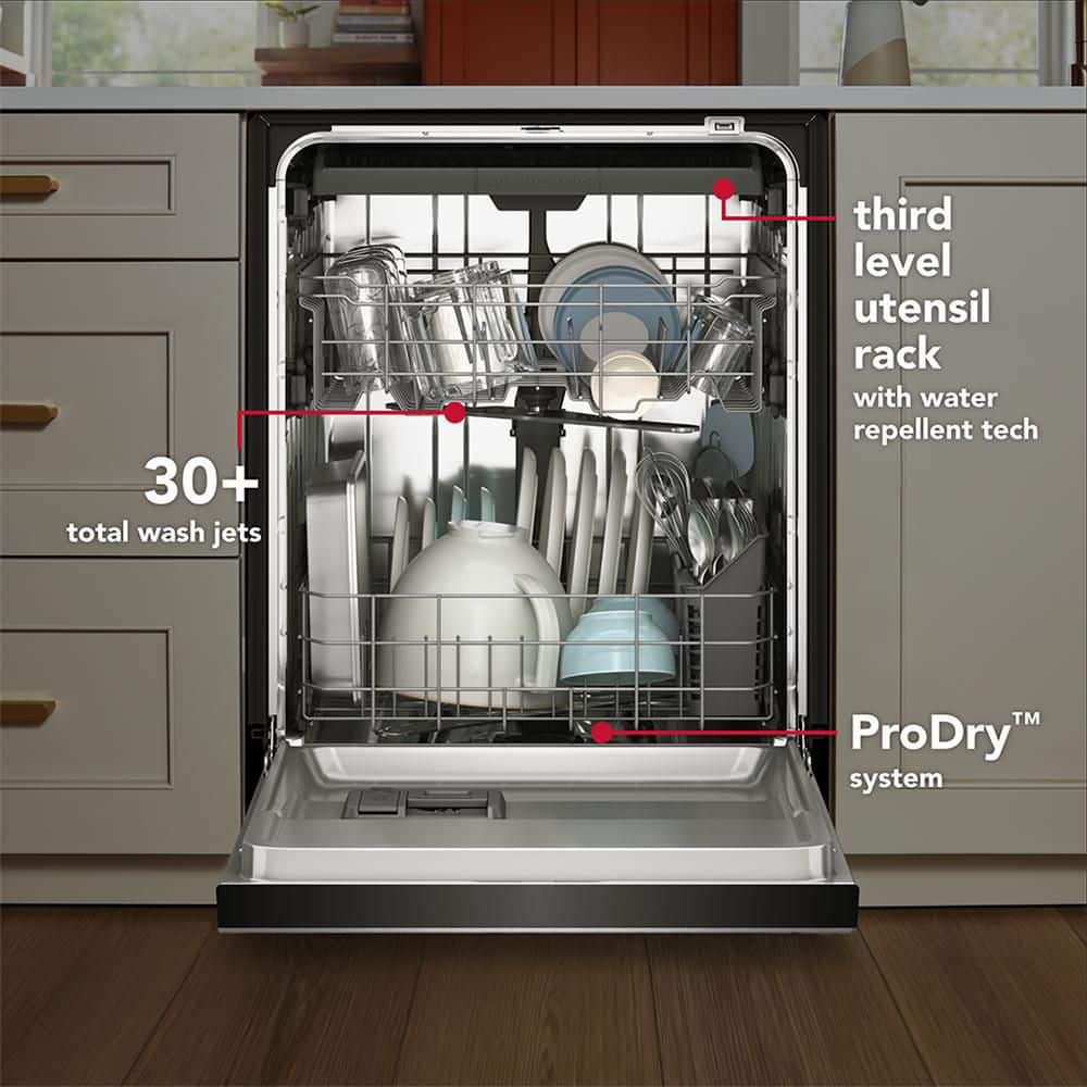Say hello to the only way to dish. This Front Control Dishwasher has 30 plus Total Wash Jets across 3-wash arms that offer targeted cleaning on every level. Third Level Utensil Rack holds silverware and serving utensils. ProDry System dries from every angle with heating elements, water repellent tech and natural ventilation. Triple Filtration System circulates clean water to wash and rinse. ProWash Cycle automatically adapts wash time and water temperature based on soil levels.