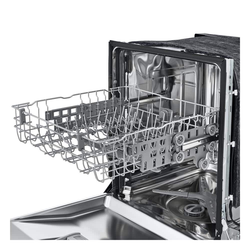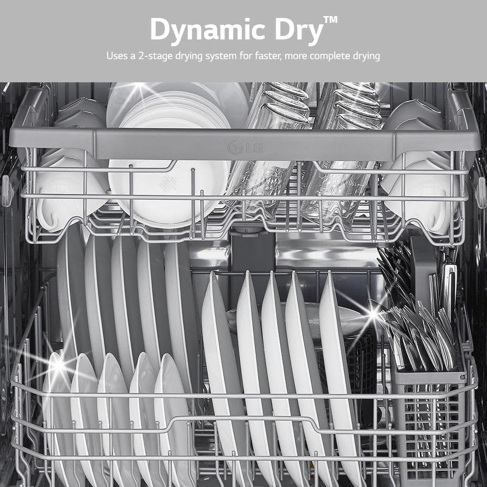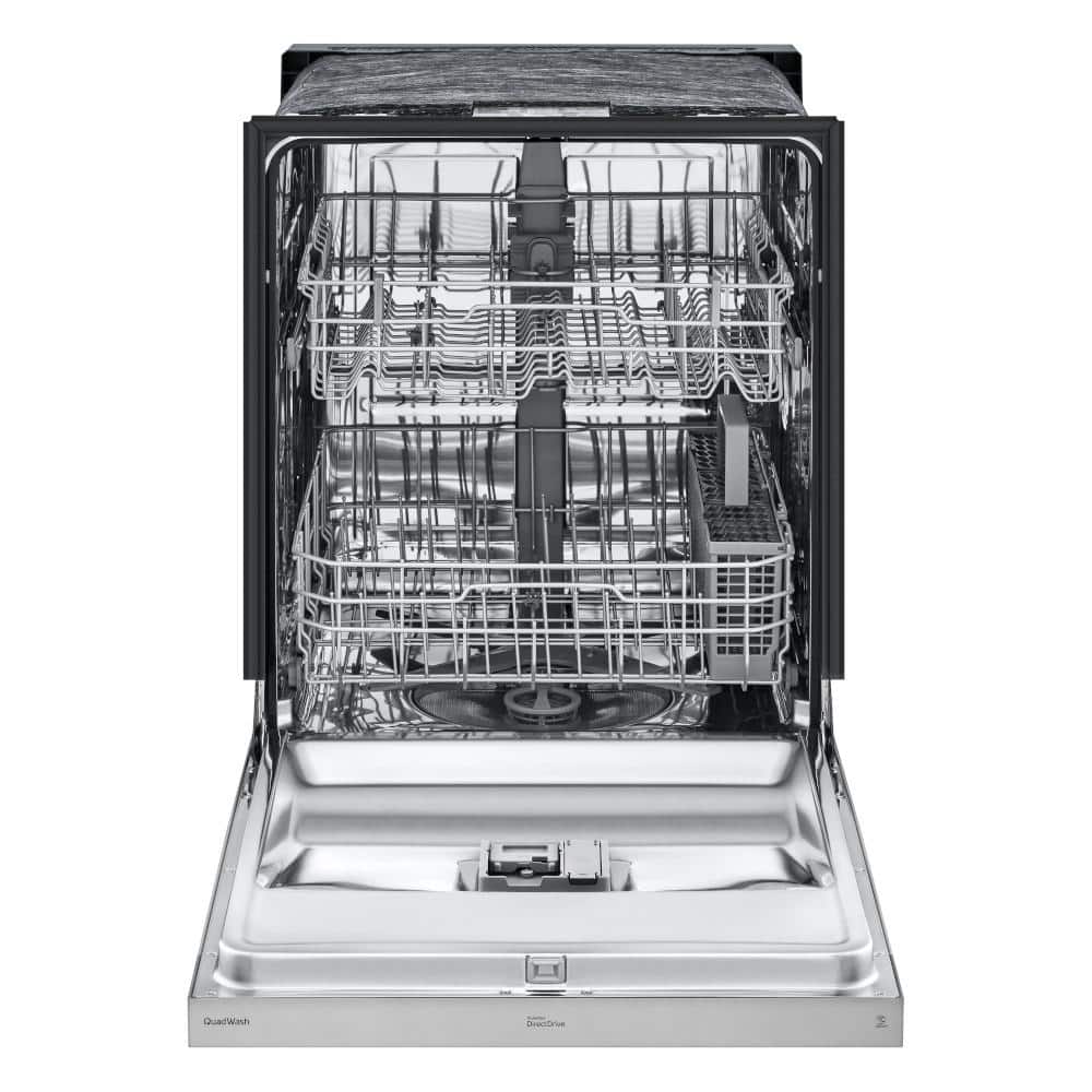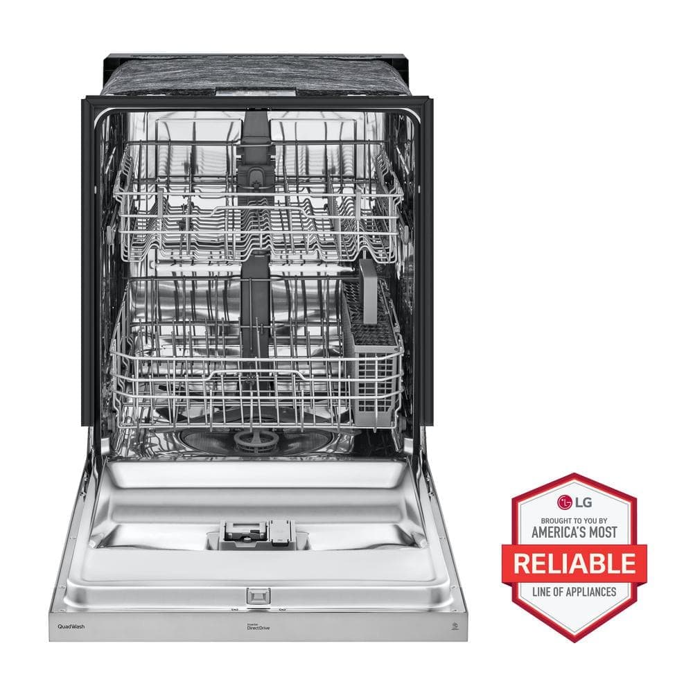 Take your kitchen to the next level with this LG 24 in. in Stainless Steel Front Control Dishwasher. his QuadWash dishwasher features four spray arms for a thorough wash. The Dynamic Dry feature makes sure your dishes dry without spots. The rack adjusts to best suit your needs and the third rack provides valuable cleaning space.