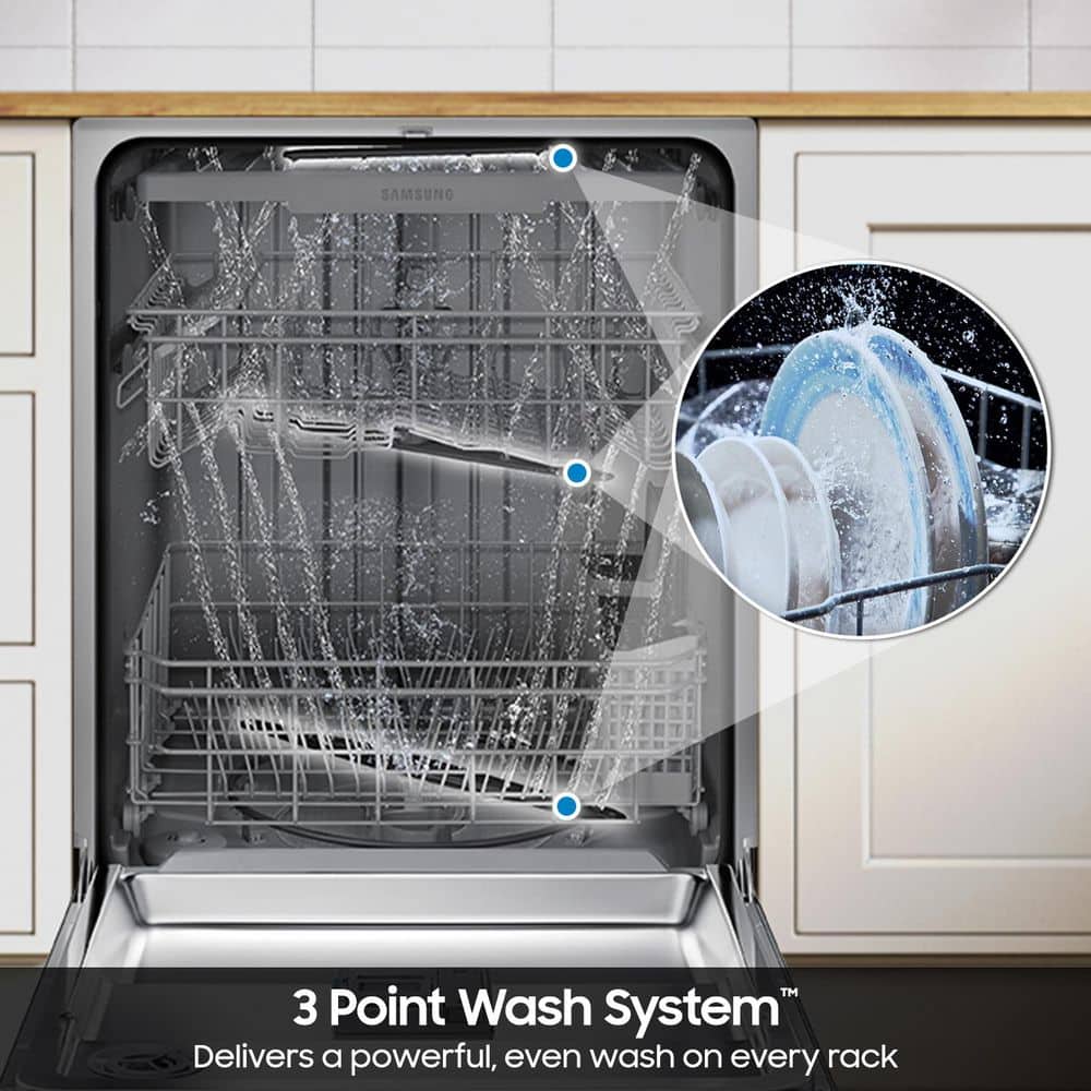 This dishwasher features a convenient 3rd rack, enabling you to load dishes and utensils more efficiently. The 3 Point Wash Systemincludes three powerful wash arms to deliver a powerful,even spray on every rack. And with AutoRelease Door Drying, you'll see improved drying performance leaving your dishes spotless. Enjoy a peaceful kitchen - withoutthe background noise with a whisper quiet dishwasher with 51 dBA noise levels.