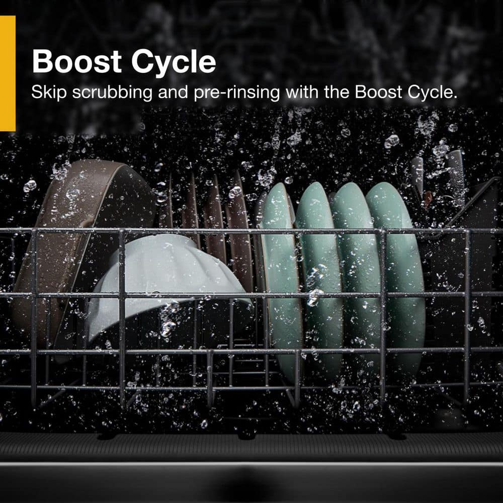 Clean dishes with a 51 dBA quiet dishwasher. A 3rd Rack lets you load hard-to-fit utensils to free up more space while the Fingerprint Resistant finish resists smudges and is easy to clean. This dishwasher also includes an Adjustable 2nd Rack to accommodate taller items and a Triple Filtration Wash System that filters food particles and cleans water between wash stages.