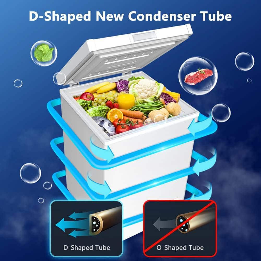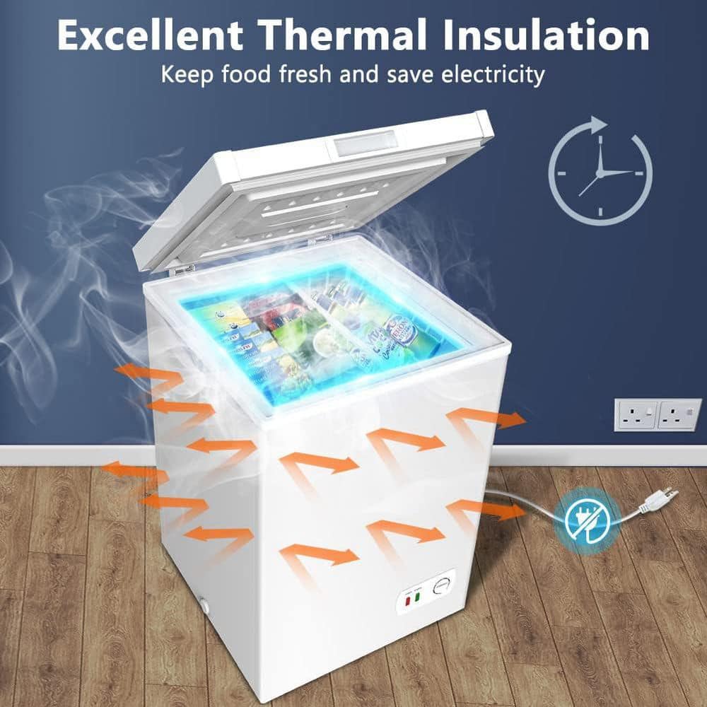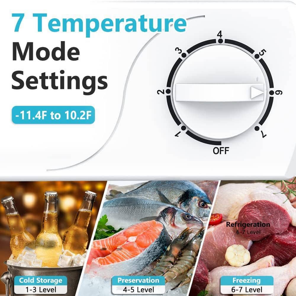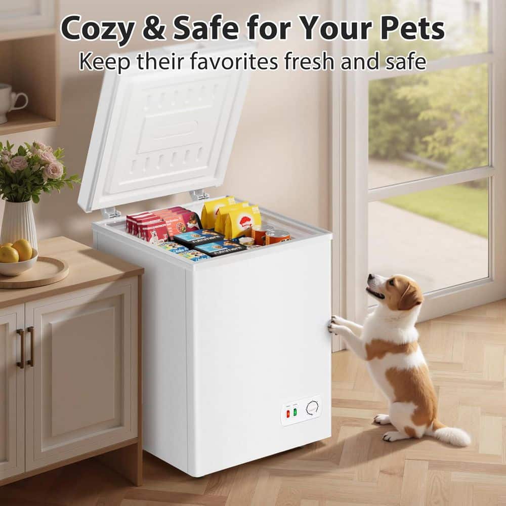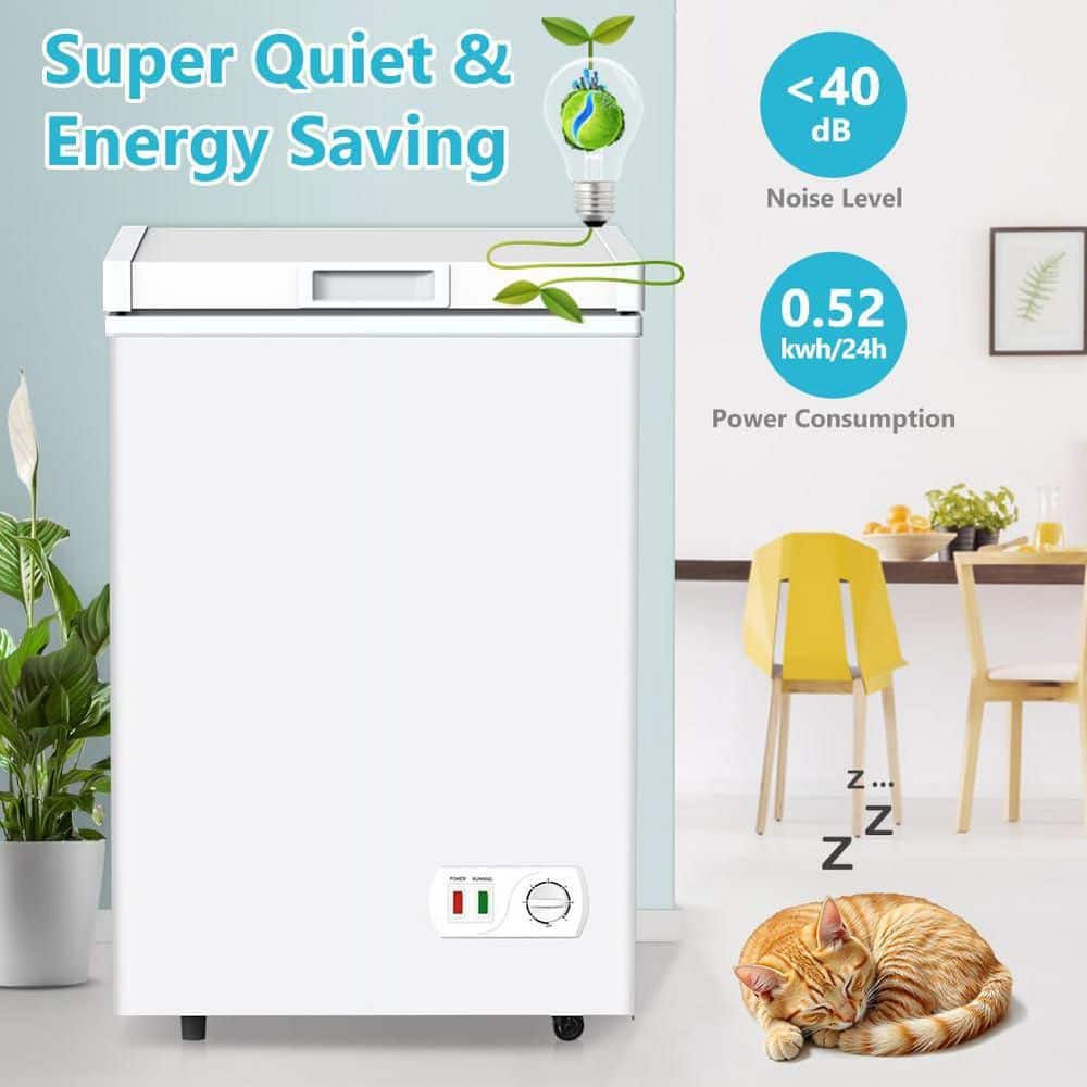 This 4.2 cu.ft white chest freezer blends compact size with large storage, ideal for small spaces. It has 7 adjustable temps (-11.4°F~10.2°F) and fast cooling D-tube. Energy-saving (0.52kwh/24H), super quiet (not exceeding 40 decibels), portable with wheels, and a removable basket-perfect for renters' extra food storage needs.